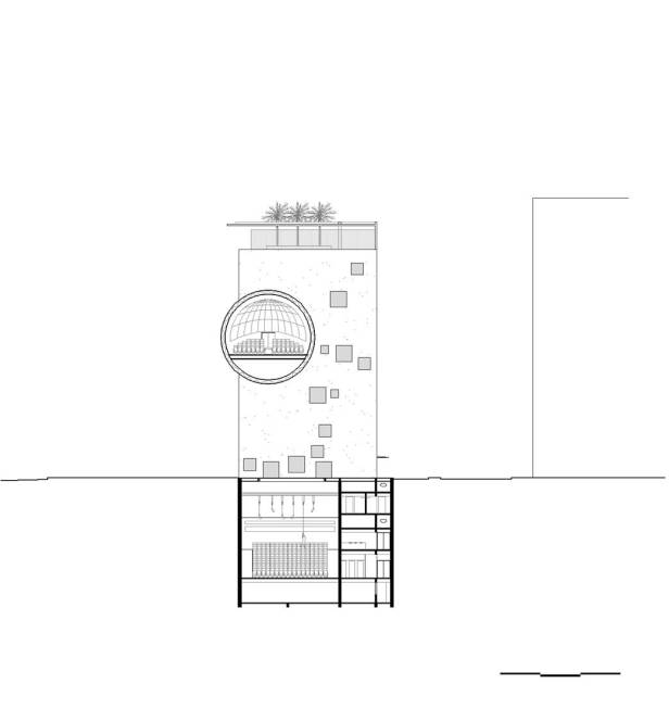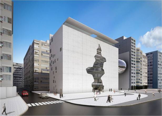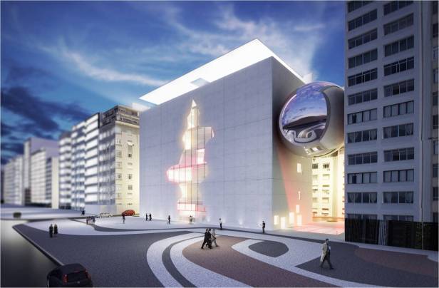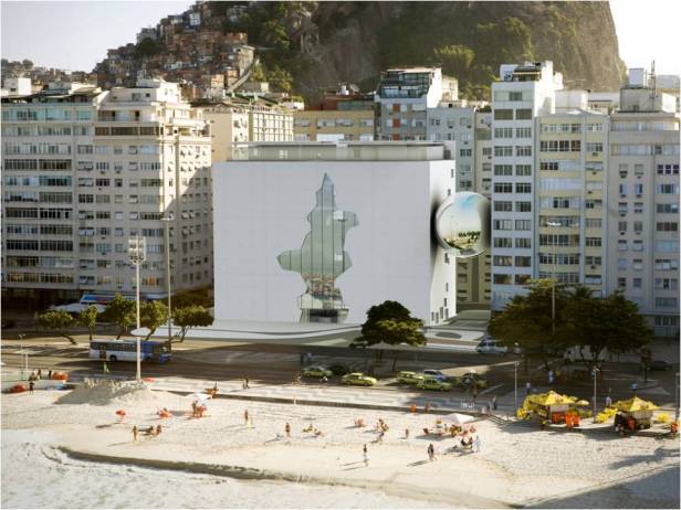 E sobre esta passagem, como que flutuando, uma esfera em aço brilhante abrigará o auditório de projeção múltipla. Será uma verdadeira escultura urbana, uma nova imagem intrigante e poética na orla de Copacabana, e também espelho de uma das mais belas paisagens da Cidade Maravilhosa.”