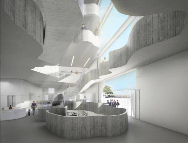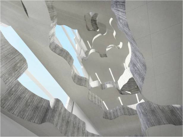 Ao adentrarmos o edifício, pelo hall do pavimento térreo, estaremos diante de um grande buraco, ou melhor, de uma seqüência de buracos a perfurar todas as lajes; buracos de diversas dimensões, formas livres e anômalas, que farão a comunicação visual interna entre todos os pisos e permitirão a compreensão imediata do funcionamento do Museu. Todo o edifício será em concreto armado, com um sistema estrutural extremamente racional e simples: lajes nervuradas apoiadas nas espessas paredes longitudinais.