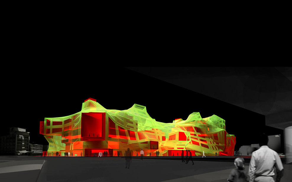 “Uma enorme estrutura verde é marcada por diferentes partes do programa que se destacam em direçaõ ao espaço público, permitindo vistas da cidade. Esses espaços incluem cafés, bares, espaços vips, etc. As 3 salas de espetáculo são volumes separados dentro dessa grande casca verde. Assim como no projeto do OMA, a proposta de JAKOB+MACFARLANA propõe uma área técnica comum às 3 salas. O foyer de cada sala é integrado visualmente à grande área de acesso do público, no pavimento térreo. O aspecto semi-transparente da casca permite que o interior do complexo possa ser antecipado a partir da ‘cidade exterior’. À noite, o Centro funciona como uma fonte de luz, como celebração à arte performática.”