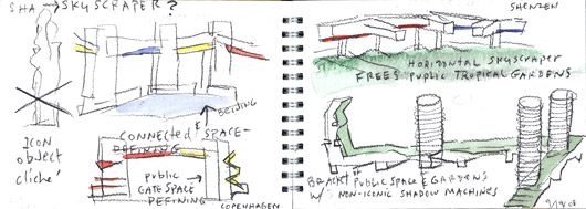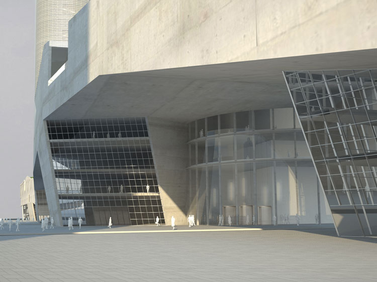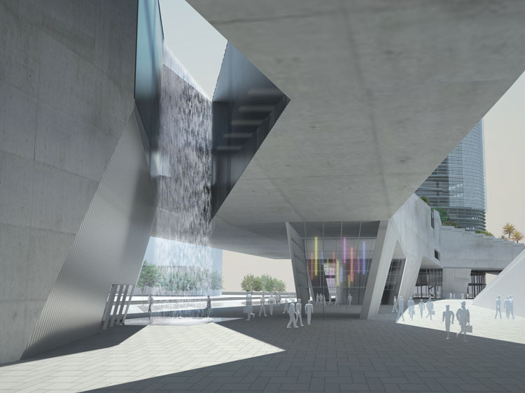 Segundo o arquiteto, a forma escultórica do elemento de articulação permite a adequação do projeto às restrições ambientais e às demandas programáticas. O resultado é a criação de um parque contínuo na cobertura, que serve também como elemento de coleta de águas pluviais, assim como base para a reciclagem de águas servidas das quatro torres (sistema de reciclagem baseado em raios ultravioleta). Toda a área coletiva do projeto é acessada por meio de estações de metrô, que se conectam diretamente com as torres.