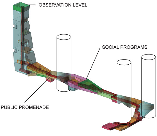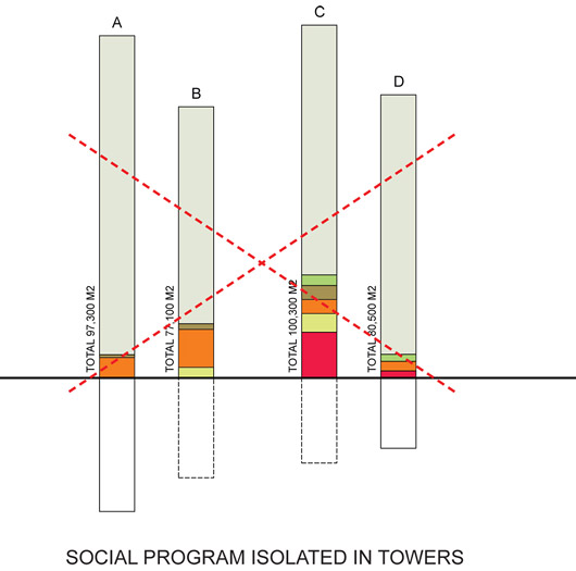 O elemento de articulação social reúne os elementos de uso coletivo que integravam o programa das quatro torres, que são articuladas por meio de um elemento contínuo que dá acesso ao nível da rua. Espaços como centros de atividade esportiva, cafés, espaços culturais, auditórios, cinemas e galerias integram o programa do elemento de articulação (“social bracket”).