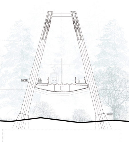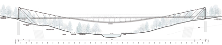 “A paisagem do vale nos inspirou no desenho de uma estrutura que oferecesse o mínimo de impacto visual aos passageiros. Uma estrutura com múltiplos suportes destruiria a visão contínua do vale, e causaria uma impressão egocêntrica, como uma afirmação arquitetônica sobre a natureza, o que seria um desrespeito à beleza da paisagem. A idéia de um projeto marcado por elementos mínimos e pela leveza da estrutura permite uma integração natural entre a ponte e os elementos naturais exsitentes.”