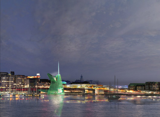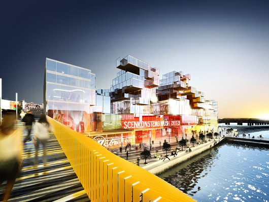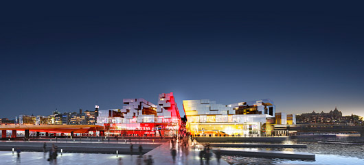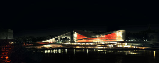 Os espaços interessantes e super-racionais do projeto do escritório Nyrens lembram uma arquitetura produzida entre os anos 60 e 70. A proposta é dominada por uma série de terraços envolventes, que descem em direção ao lago. O grande e massivo edifício de exposições está situado sobre a área destinada ao terminal de ônibus, como um elemento isolado e monumental, dentro da praça sugerida no projeto. (N.O., NYT, 16.mar.2009)