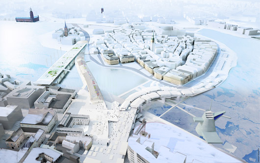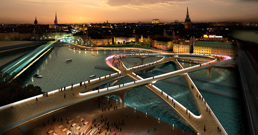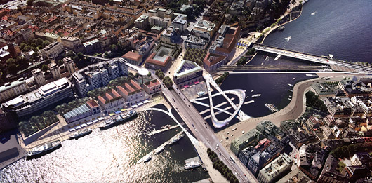 “O projeto do arquiteto Gert Wingardh, da Suécia, evoca o grande plano arterial de Haussmann para Paris, substituindo neste caso as linhas retas pelas curvas originais do projeto de 1930. A ponte para o tráfego dos veículos é redefinida, de forma mais reta e objetiva, como uma conexão direta com o bairro medieval. A malha da cidade se estende em direção à água, aproximando os dois lados da cidade. O aspecto mais poético é uma pequena ponte de pedestres que parece flutuar sobre a superfície da água, aproximando o pedestre do cenário natural e oferecendo uma visão clara da grande estrutura que suporta a ponte de veículos. Mas o projeto é marcado também por excessos comerciais, como a torre comercial de vidro às margens do lago”. (N.O., NYT, 16.mar.2009)