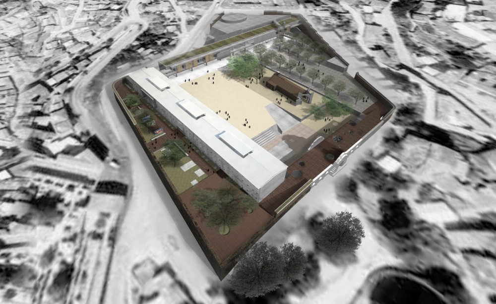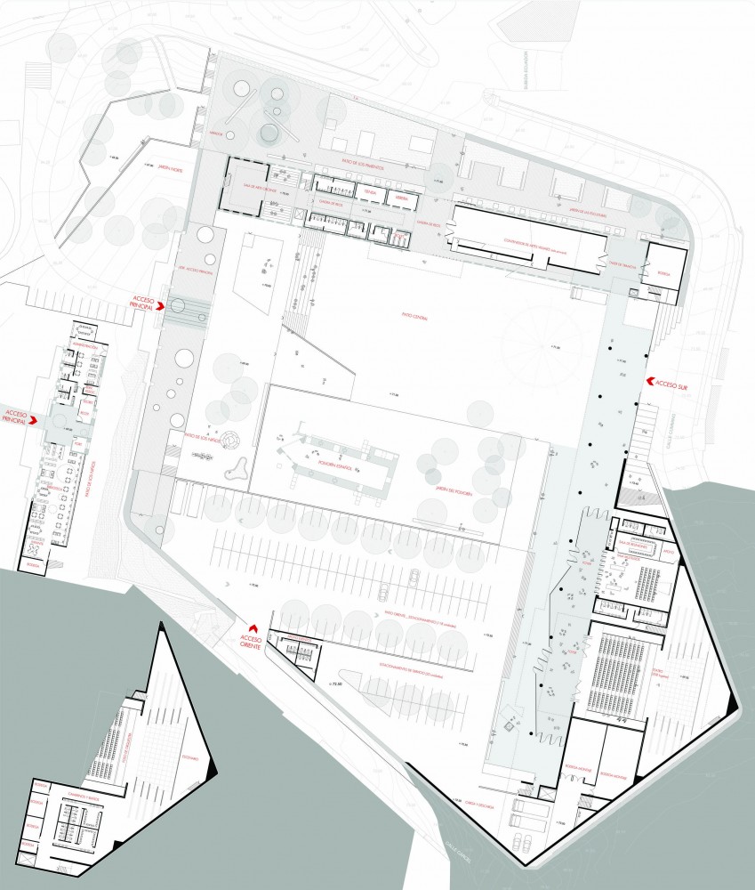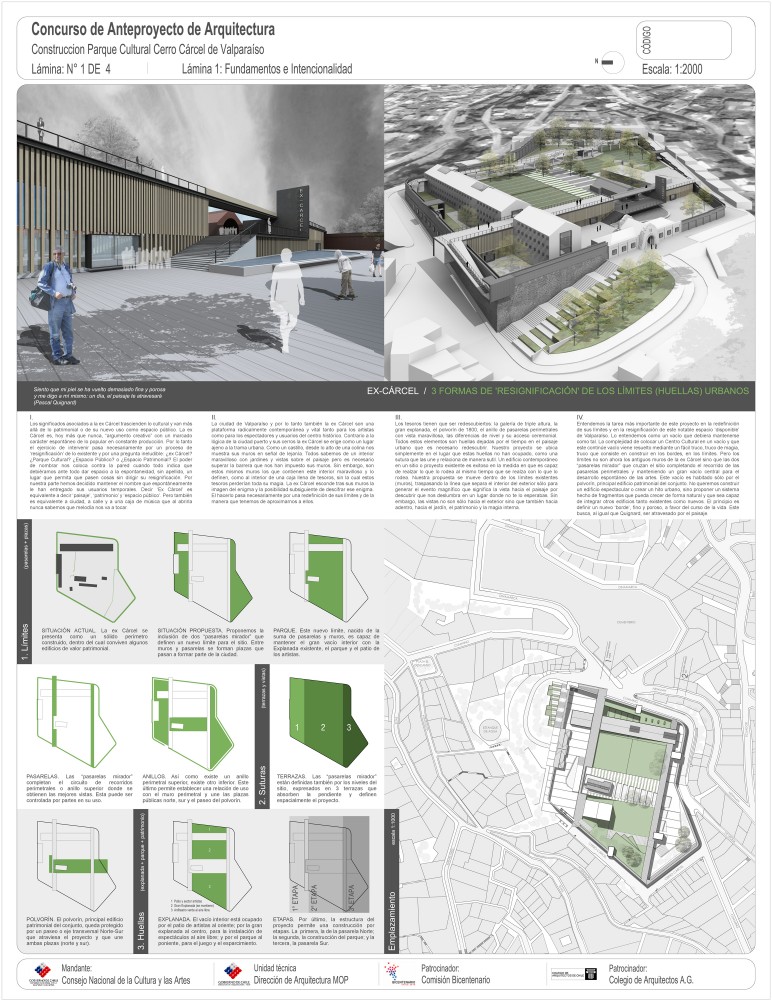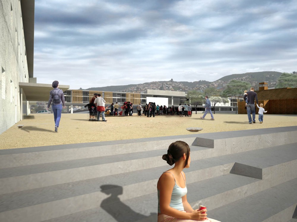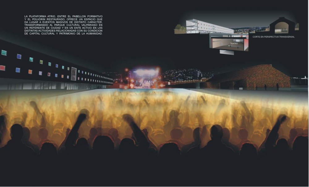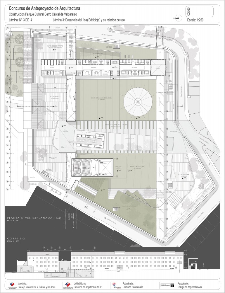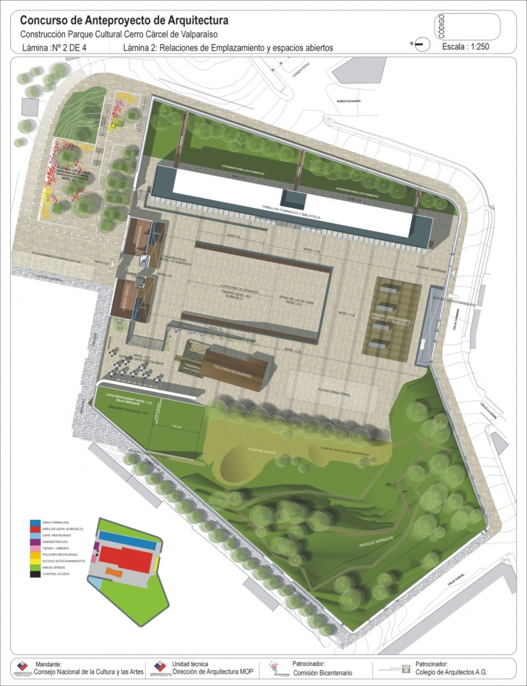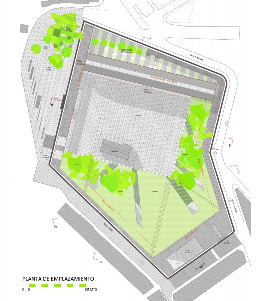 “A proposta vencedora se estrutura basicamente sobre dois volumes que acolhem o programa estabelecidos, implantados nos extremos do terreno e liberando a esplanada central, como elemento articulador do sítio em relação ao entorno. O projeto concentra a parte do programa voltada para o uso cotidiano do centro no edifício da “Galería de Reos”, com uma combinação entre plantas livres e espaços unitários, preservando-se no exterior a volumetria original do edifício. Na parte superior do terreno o projeto propõe a construção de um novo volume que, através de uma linguagem arquitetônica clara e simples, destaca-se do edifício da Galería de Reos, marcando a esplanada como eixo central da proposta. Observa-se uma relação visual e funcional com o exterior do espaço, o que permite, por sua vez, uma vista total do terreno e da cidade. Neste volume são inseridas as atividades com maior concentração de público, como o teatro, a sala de exposições e o restaurante. Entre os valores essenciais do projeto, destaca-se em primeiro lugar a linguagem contemporânea que se insere de maneira simples na trama urbana da cidade. Nesse sentido, considera-se um elemento de destaque da proposta o reconhecimento de sua esplanada e a relação com o entorno urbano, como elemento protagonista do sítio, concentrando o esforço da intervenção na reabilitação das construções existentes e na recuperação do fundo do terreno, com um edifício que propõe uma nova fachada em relação ao interior do terreno. Estes elementos são resolvidos com simplicidade, e o “polvorín” é utilizado como elemento articulador do conjunto. Desta forma, o projeto permite acolher naturalmente tanto as expressões artísticas formais, como a ocupação espontânea e massiva do terreno, oferecendo uma projeção de seu uso de maneira flexível ao longo do tempo. A comissão julgadora considera, além disso, que a austeridade da proposta vencedora se traduz em um projeto viável e compatível, em sua totalidade, com os recursos disponíveis. Graças à claridade dos ambientes, poderá abrigar com maior flexibilidade os requerimentos específicos do programa que venham a ser incorporados ao longo do uso, sem que se descaracterize a proposta original. “ (conforme ata do júri)