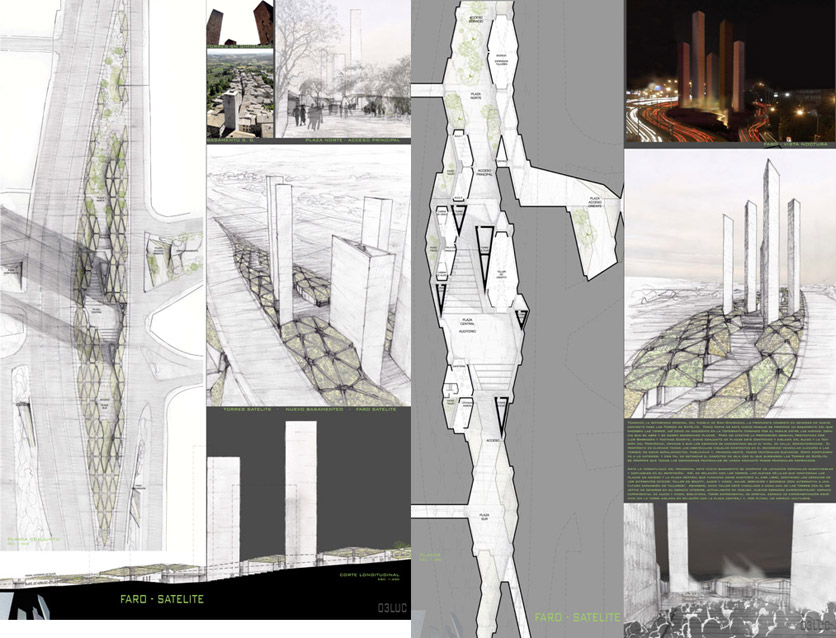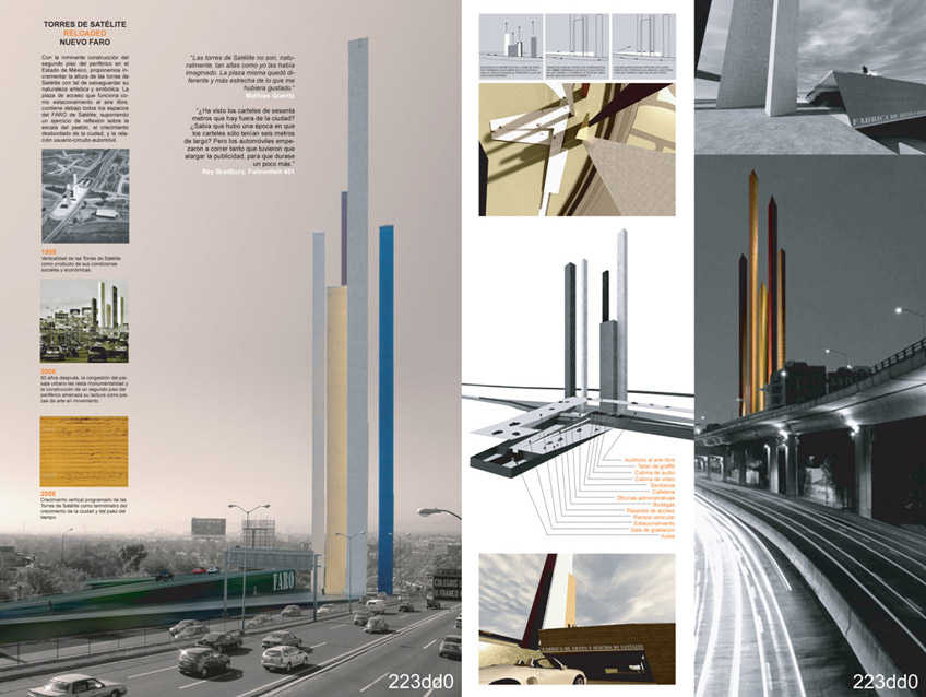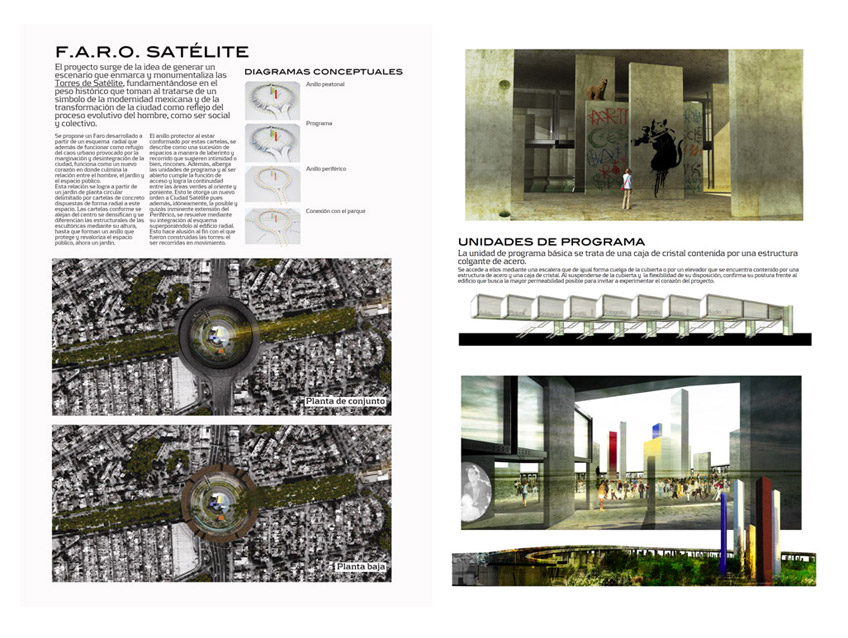 Em 2008 foi lançado Concurso Internacional Arquine Faro do Satélite, com o objetivo de reunir e premiar idéias de reformulação da atual praça e criação de um espaço de arte e cultura (FARO – Fábrica de Artes y Oficios) em torno das torres. O concurso seria uma reação a projetos viários em andamento que afetariam a percepção sobre o monumento.O programa do concurso previa a revisão dos elementos de circulação viária em torno do monumento, criação de caminhos de pedestre, ampliação da praça existente e criação de equipamentos culturais (salas de aula, cabines de áudio e vídeo, auditório, cafeteria) dedicados à prática e formação artística relacionadas à música e ao ‘graffiti’.O resultado do concurso foi anunciado em março.2009.