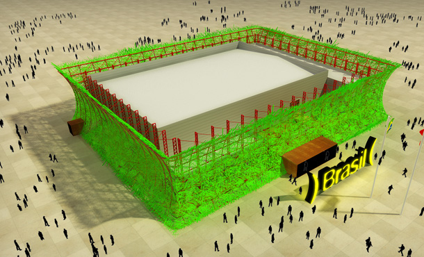 “A fachada do pavilhão, na forma de um parêntese invertido, representa justamente essa pulsação. Em desenhos animados essa forma sempre representa algo vibrando, pulsando. Por isso, desenvolvemos essa fachada, que será feita com pedaços sobrepostos de madeira reciclada e pintada de verde, que vão ser apoiadas em uma estrutura metálica. Tanto a cor, que representa a bandeira nacional, quanto as madeiras sobrepostas, que lembram os artesanatos em palha, são referências ao País.”