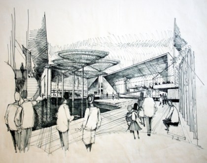 Pavilhão do Canadá, Expo 1970 Osaka – Projeto de Arthur Erickson e Geoffrey Massey, desenho da primeira fase do concurso, projeto vencedor.