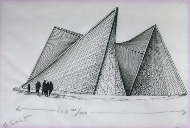 Desenho de Iannis Xenakis para o pavilhão Philips na Expo 1958, baseado na transcrição geométrica de uma peça musical do próprio Xenakis. Projeto em colaboração com Le Corbusier.