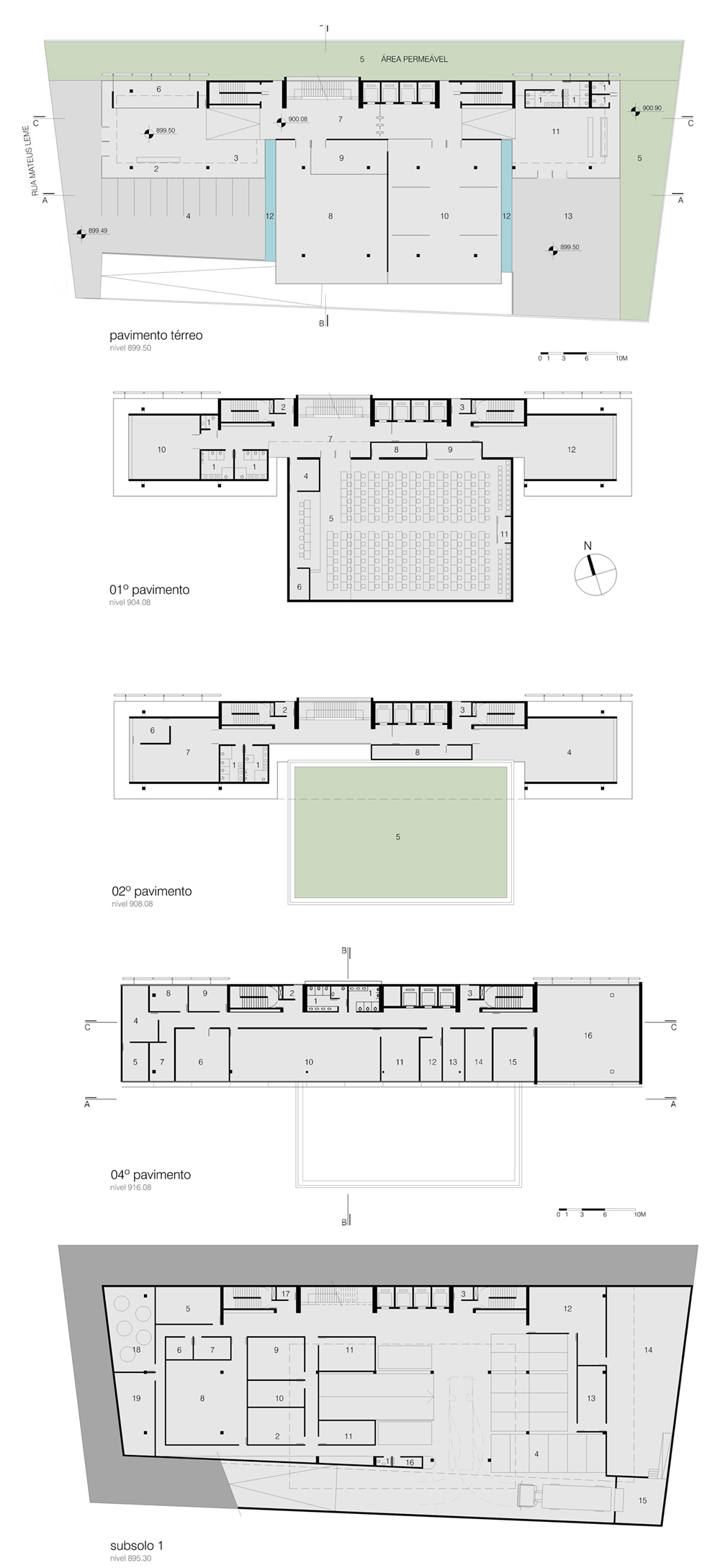 O programa. Os páteos, interno e externo, criados respectivamente para oferecer espaços de convívio e estacionamento, foram pensados também como alternativa à atividades culturais, uma das demandas do programa. O volume da plenária foi elevado do solo para acomodar em sua base transparente, a área de atendimento da Regional do CREA_PR e as salas de eventos. No primeiro e segundo pavimentos, além da plenária, localizam-se as áreas de apoio e correlatas à esta que, junto com o térreo, constituem-se no núcleo principal do programa, estando em posição privilegiada de acessibilidade. O primeiro subsolo comporta o principal do programa do DESUS, além da doca para caminhões e das vagas para vans e frotas. O segundo subsolo foi destinado ao restante das vagas cobertas. Todo o programa complementar foi distribuído nos pavimentos restantes ficando a cobertura destinada à área de convivência de funcionários e equipamentos.