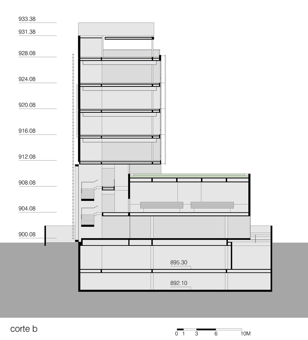 Ecoeficiência e conforto ambiental. O edifício foi implantado de forma a aproveitar a melhor condição de insolação. Uma lâmina horizontal com 7 pavimentos, orientada na direção longitudinal tem sua fachada mais transparente e de maior dimensão voltada ao sudoeste, possibilitado por uma insolação moderada de poente. Uma parcela menor dos vidros voltados ao nordeste são protegidos por brises horizontais. Os pavimentos típicos, dimensionados considerando o melhor aproveitamento dos recusos passivos de iluminação, possuem largura de 12,8m e 68m de comprimento, garantindo uma distância máxima de 9m entre núcleo e a linha de caixilhos em qualquer ponto do pavimento.