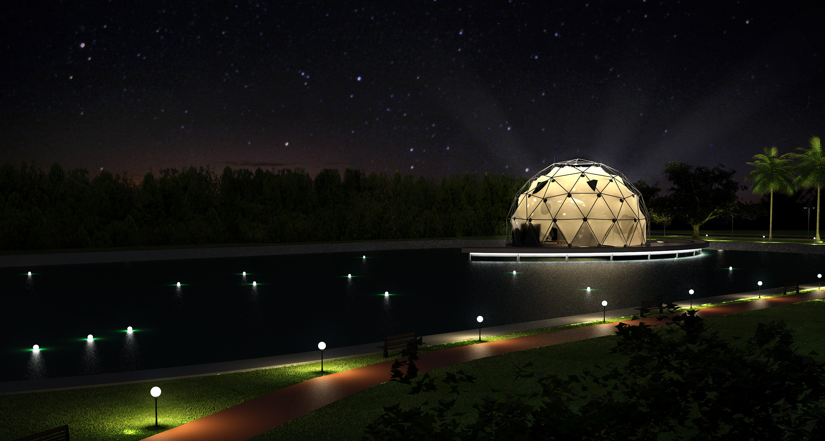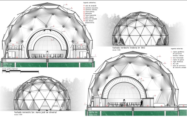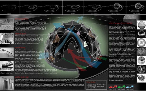 Quanto ao partido me admirei pela pouca criatividade da proposta em reproduzir um conceito esteriotipado utilizado por planetários em qualquer lugar do mundo. Segundo por se tratar de um modelo pronto modelado para sketchupe e disponível para download em: http://sketchup.google.com/3dwarehouse/details?mid=a4295f6b93a3e11488961f28097fe890 .