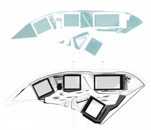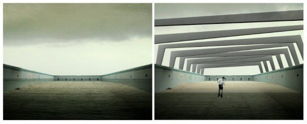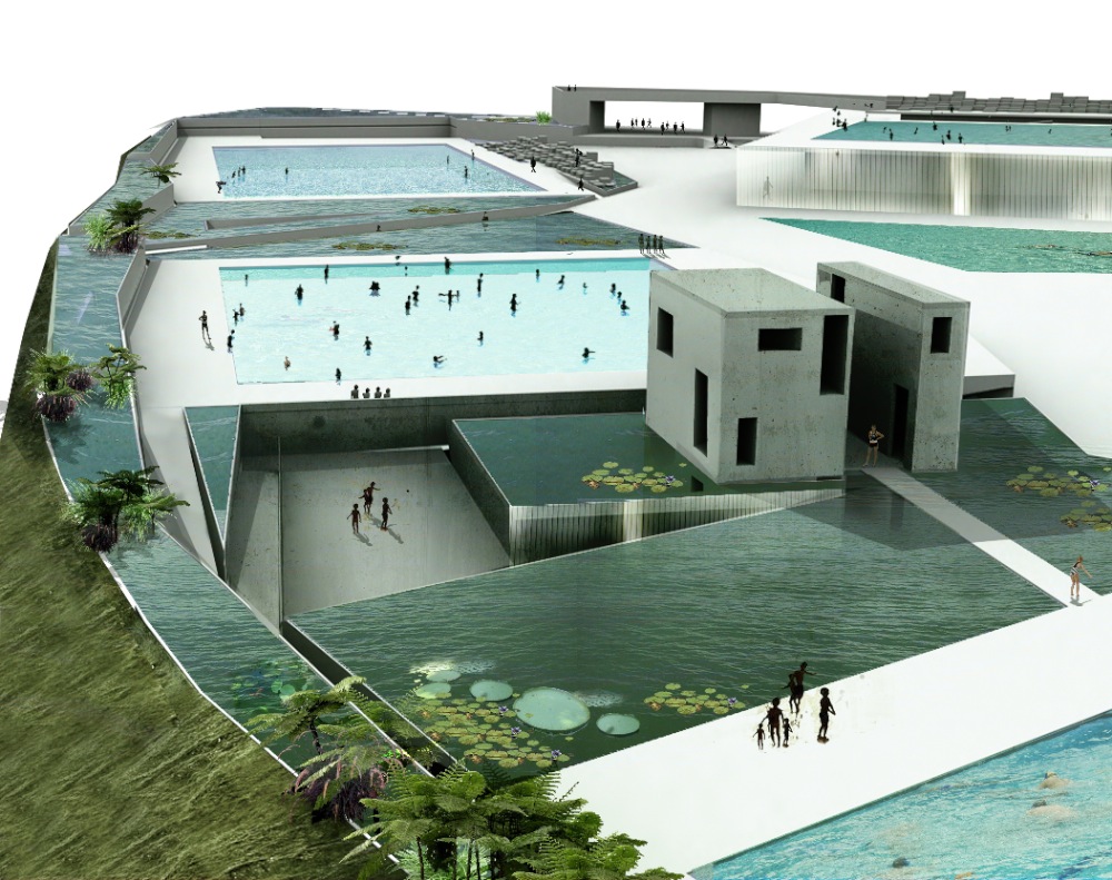 O geometria das formas retas contextualizou com o sítio irregular de maneira organizada possibilitando uma leitura de imedito na disposição das piscinas em uma linha contínua que se desenvolve com um tratamento urbanístico bem elaborado e destacado em virtude de outros programas funcionais estarem ocultos.