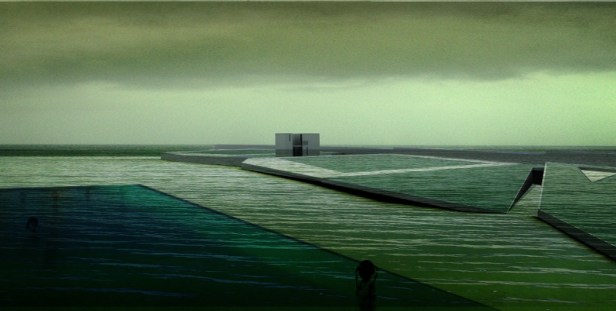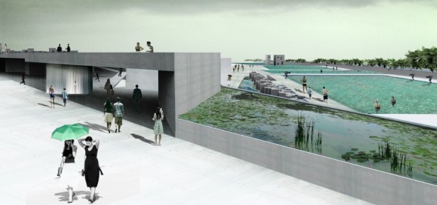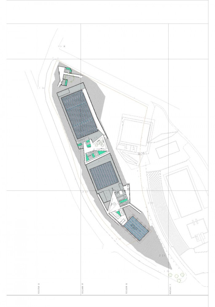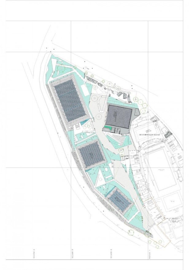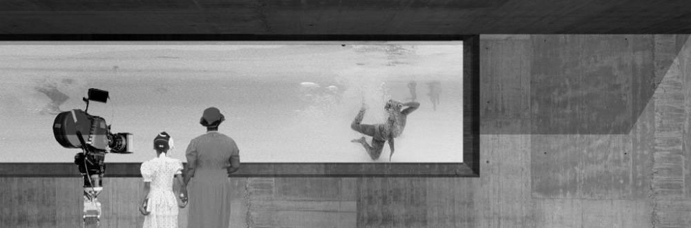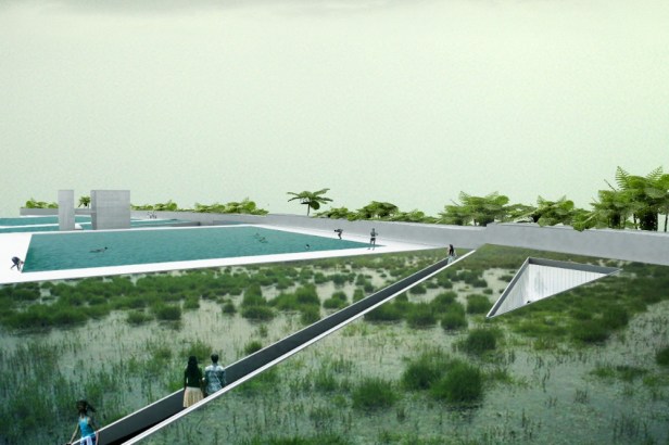 As áreas de serviço (sanitários, vestiários e áreas técnicas) estão situadas abaixo dos espelhos d’água e voltadas para pátios que se revelam “como incisões em meio às zonas de inundação”.