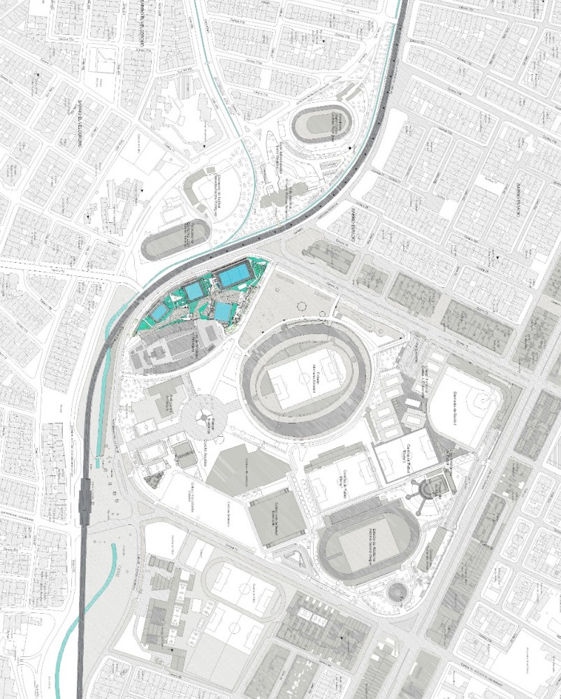 O complexo aquático é composto por uma série de programas menores, cada um de forma autônoma e independente em sua solução espacial e técnica. Esses elementos do programa são articulados entre si por meio de uma proposta paisagística baseada em elementos aquáticos.