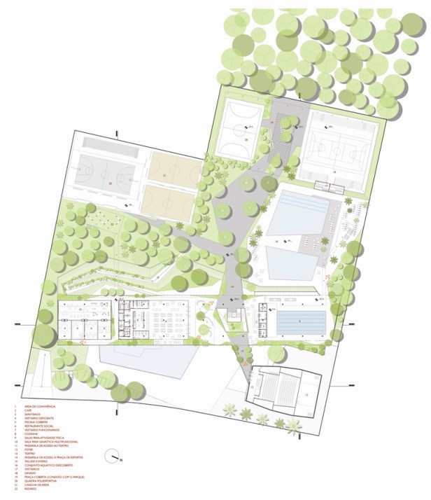 Além disso, prestou-se particular atenção a questões de conforto higrotérmico, acústico, visual e olfativo. Estratégias simples como localização de plantas e espelhos d’água em locais estratégicos permitem controle de temperatura e umidade. Nos dias mais quentes, aspersores de água ao longo da fachada são capazes de reduzir em até 3 graus a temperatura do ar. Painéis permeáveis de placas cerâmicas favorecem a ventilação cruzada e iluminação natural ao mesmo tempo em que bloqueiam os ventos fortes e o sol intenso. A lâmina representada pelo edifício principal segrega as atividades esportivas e de lazer do barulho da rua, mas a permeabilidade visual de dentro e de fora do edifício permitem irrestrita integração visual.