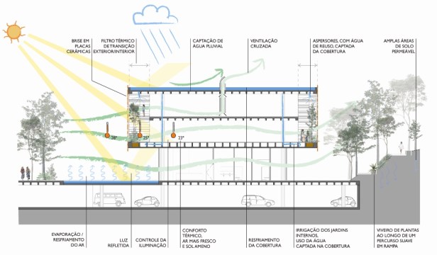CONFORTO: especial atenção foi dada ao papel de auto-regulação térmica do edifício. Graças às estratégias adotadas, especialmente o ‘envelope’ representado pelo painel de placas cerâmicas, criam-se espaços com boa iluminação natural, controle de insolação e ventilação cruzada contínua, mas reduzindo velocidade dos ventos e permeabilidade visual. Aspersores de água ao longo deste envelope são uma estratégia barata e eficiente para o controle de temperatura nos dias mais quentes. A relação do objeto construído com o terreno se dá de forma fluida, estimulando o contato entre as funções e os espaços internos e externos através de passarelas, vazios e aberturas. Abrigada do barulho externo pelo volume do edifício principal, a praça suspensa goza de tranqüilidade para a prática de esportes e atividades de lazer. Ademais, os espelhos d’água e a vegetação foram utilizados não somente como paisagismo, mas também como elementos de controle de temperatura do ar, seja pela evapotranspiração das plantas dos jardins e das fachadas, seja pela evaporação da água que ajuda a resfriar e umedecer o ar. O espelho d’água na cobertura ajuda, ainda, a aumentar a inércia térmica do edifício.