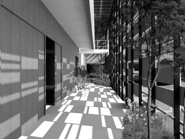A lâmina comporta-se como uma somatória de pequenos edifícios, ‘vazios’ e canteiros envoltos por uma pele permeável e conectado por acessos e passarelas que interligam o edifício ao terreno. Isso facilita a identificação das funções, cria espaços interessantes e integrados, promove transição entre o exterior e o interior e facilita a ventilação e a iluminação de cada função individual. Espaços livres e o uso de alturas variáveis no interior do edifício auxiliam a circulação de ar.