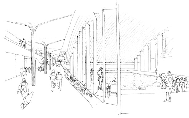 Os desníveis serão tratados por jardins verticais. Palmeiras na divisa do SESC com o Parque Vicente Leporace marcará um limite sem se constituir, no entanto, em separação visual.