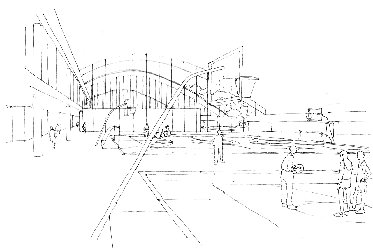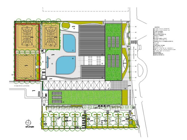 O conjunto esportivo foi articulado entre duas praças. A primeira, no nível mais baixo, ao lado das piscinas forma uma área de convívio, estudo e relaxamento, ora sombreada por uma grande árvore, ora exposta ao sol com gramado. A segunda, no ponto mais elevado, ao lado da cancha de areia e quadras descobertas, conforma um mirante da onde é possível apreender o conjunto. Entre as praças uma alameda sombreada dá acesso aos equipamentos do conjunto. Uma pista de corrida de piso emborrachado igual ao previsto para as quadras encerra um percurso de aproximados 230 metros e percorre o platô do nível mais alto, em volta da quadra principal e da cancha de areia.