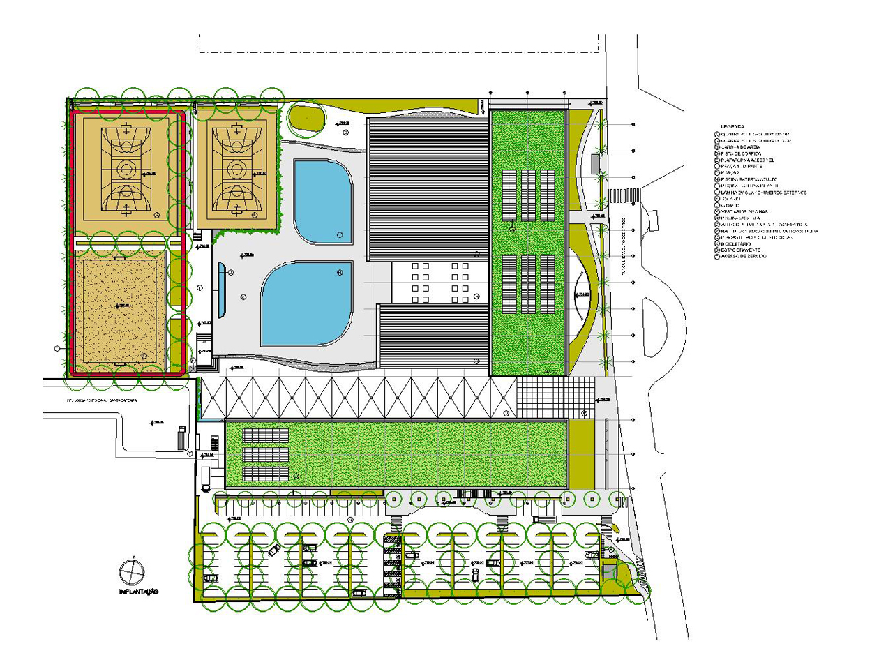 As áreas externas da qual fazem parte o conjunto aquático descoberto com solário, as quadras poliesportivas externas e a cancha de areia, foram orientadas de maneira favorável em relação a insolação e posicionadas próximas ao parque municipal, dando assim continuidade paisagística as áreas livres. As edificações foram organizadas em dois blocos principais, ortogonais entre si articulados por Átrio Central linear, em estrutura metálica, que abriga o acesso, as principais áreas de convivência, as circulações e articula as áreas externas e internas do conjunto com o entorno urbano local.