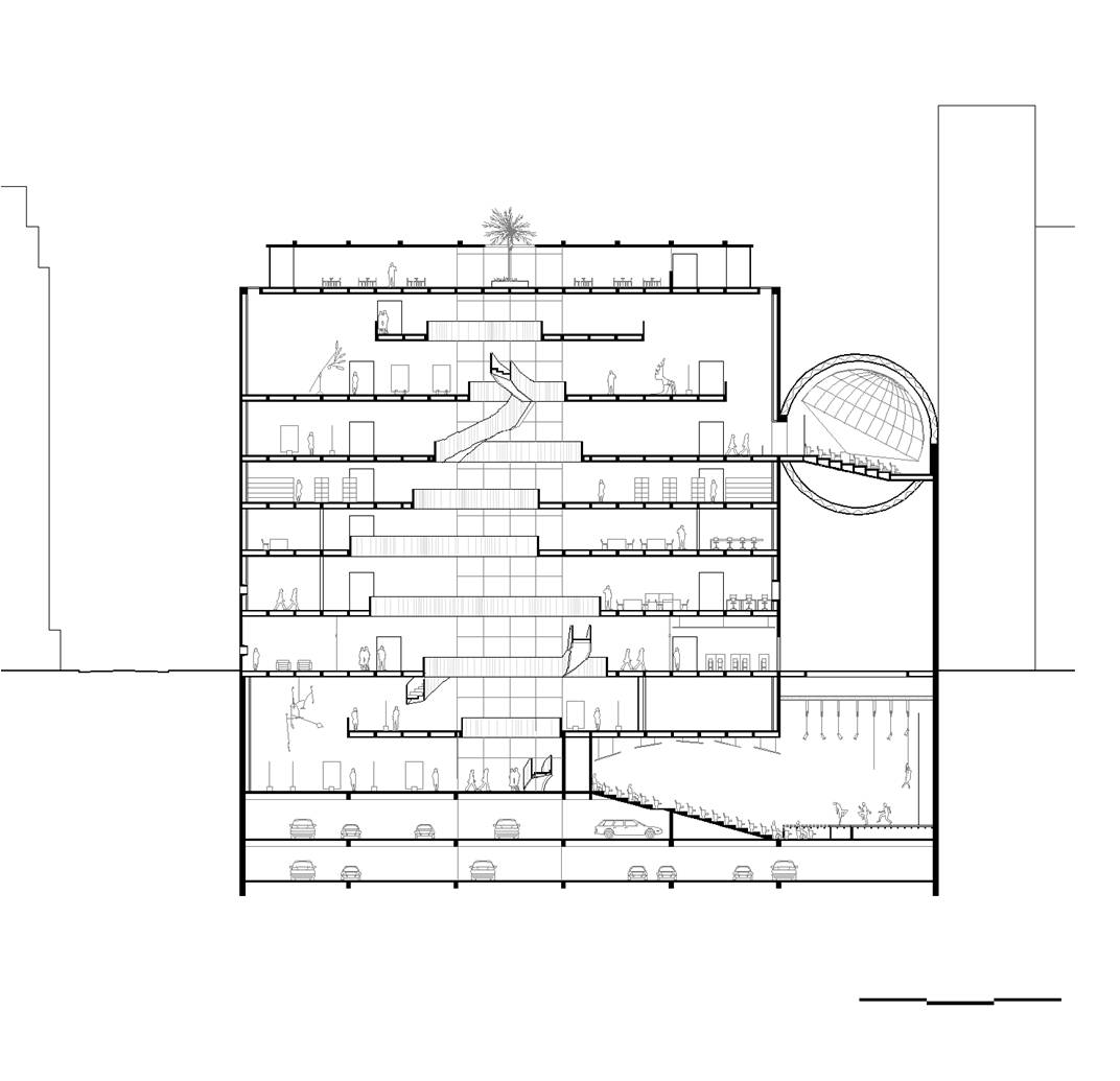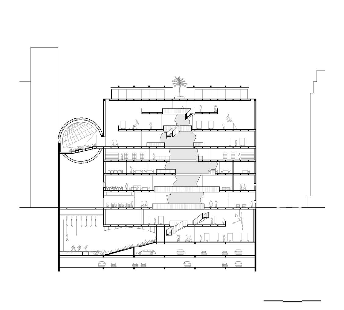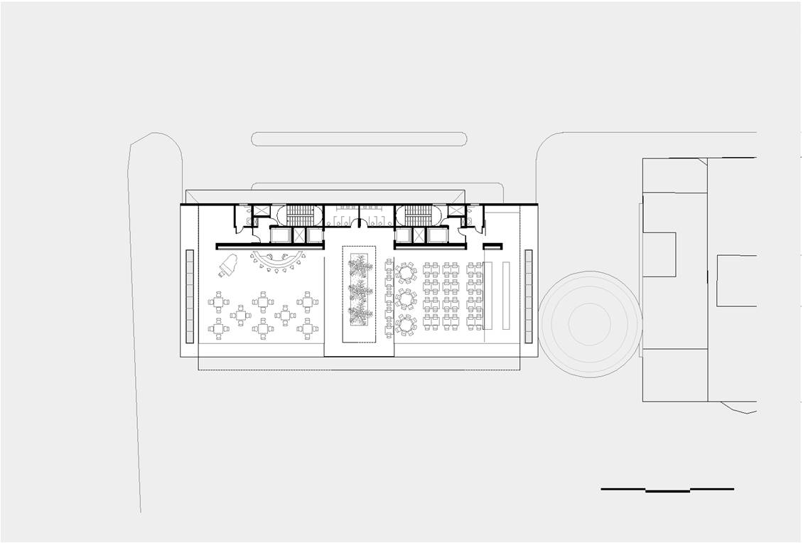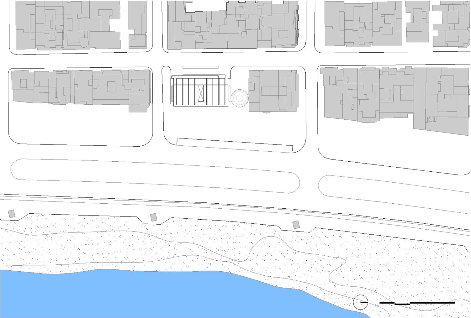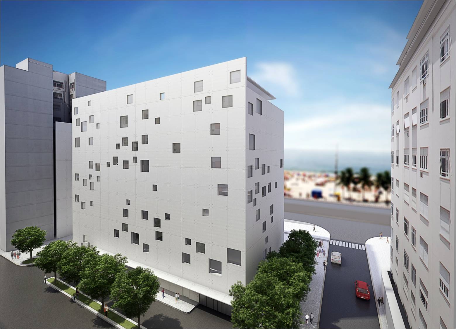 O recuo lateral no pavimento térreo será utilizado como esplanada avançada do bar/café e também como passagem franca da Av. Atlântica para a Rua Aires de Saldanha. Portanto, se por um lado, o edifício se integra à paisagem de Copacabana recompondo seu gabarito, por outro, reforça a fluidez da circulação de pedestres: acessibilidade, gentileza e conforto urbano.