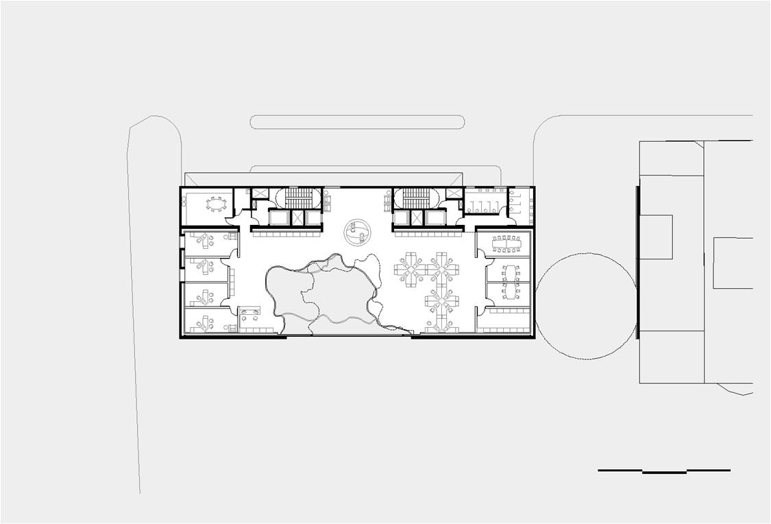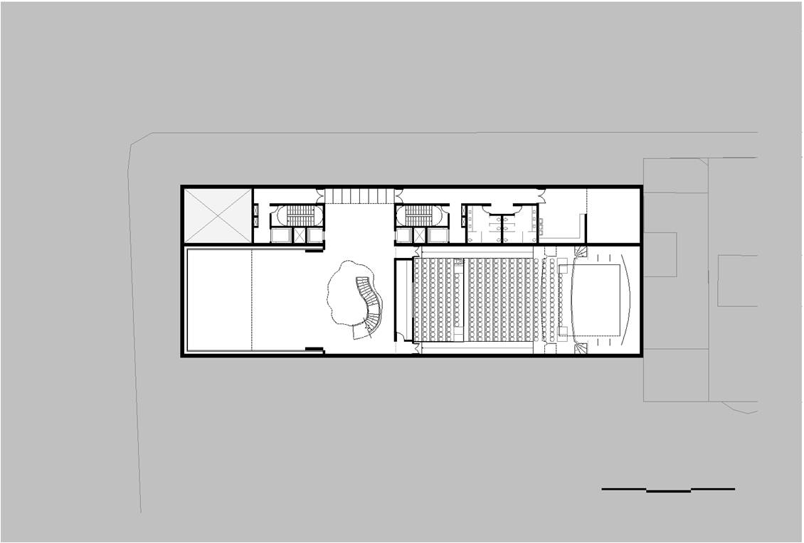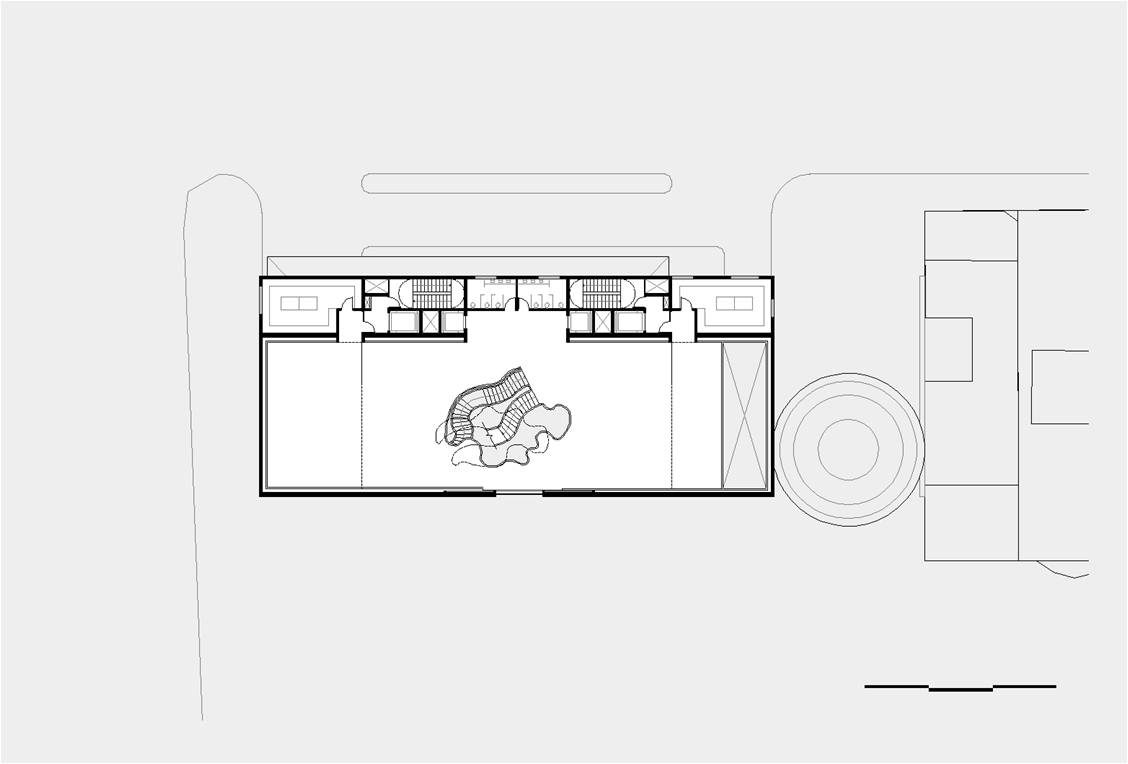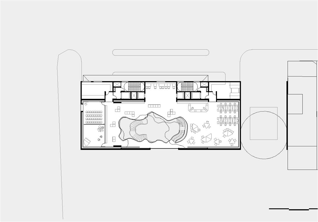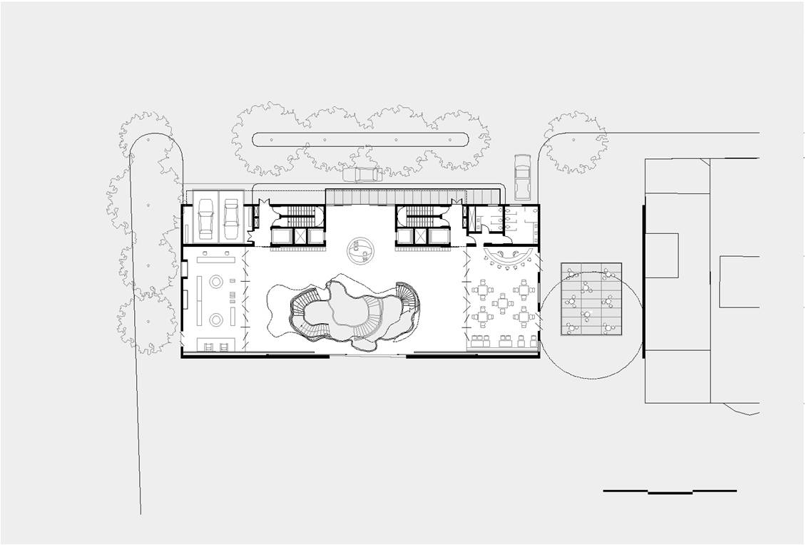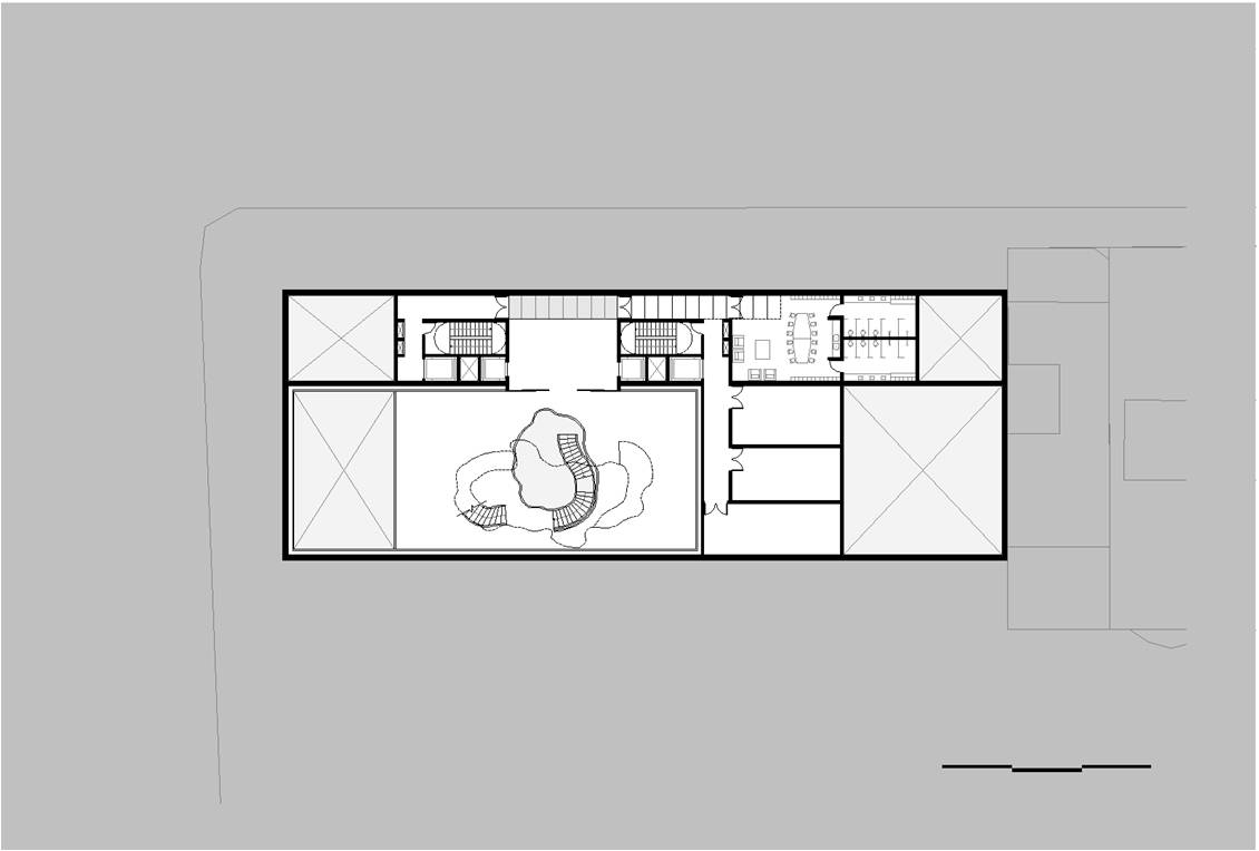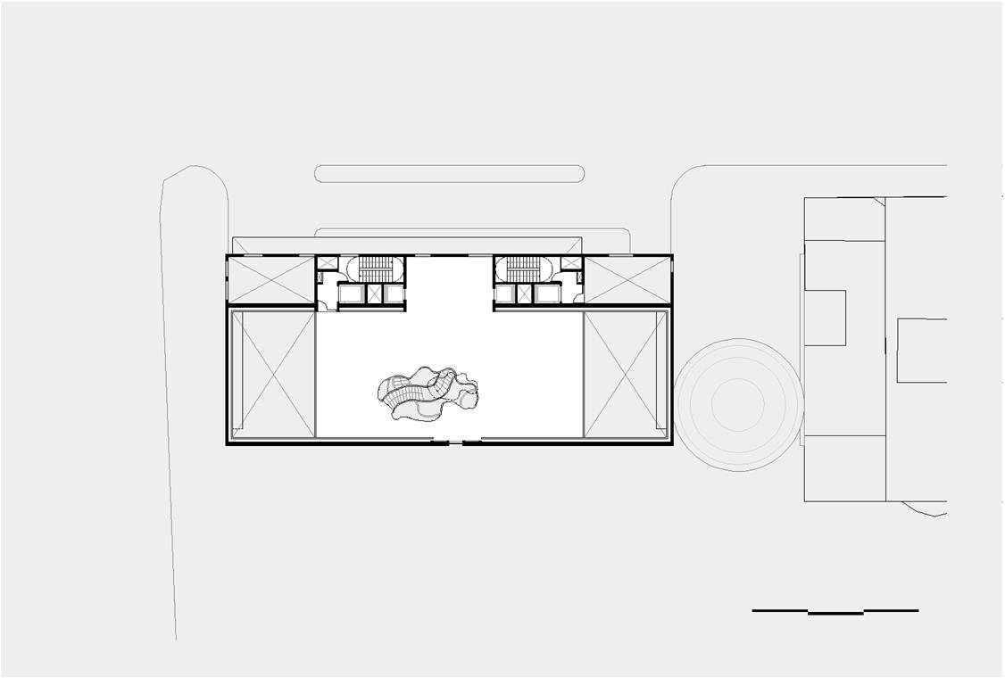 O recuo lateral no pavimento térreo será utilizado como esplanada avançada do bar/café e também como passagem franca da Av. Atlântica para a Rua Aires de Saldanha. Portanto, se por um lado, o edifício se integra à paisagem de Copacabana recompondo seu gabarito, por outro, reforça a fluidez da circulação de pedestres: acessibilidade, gentileza e conforto urbano.