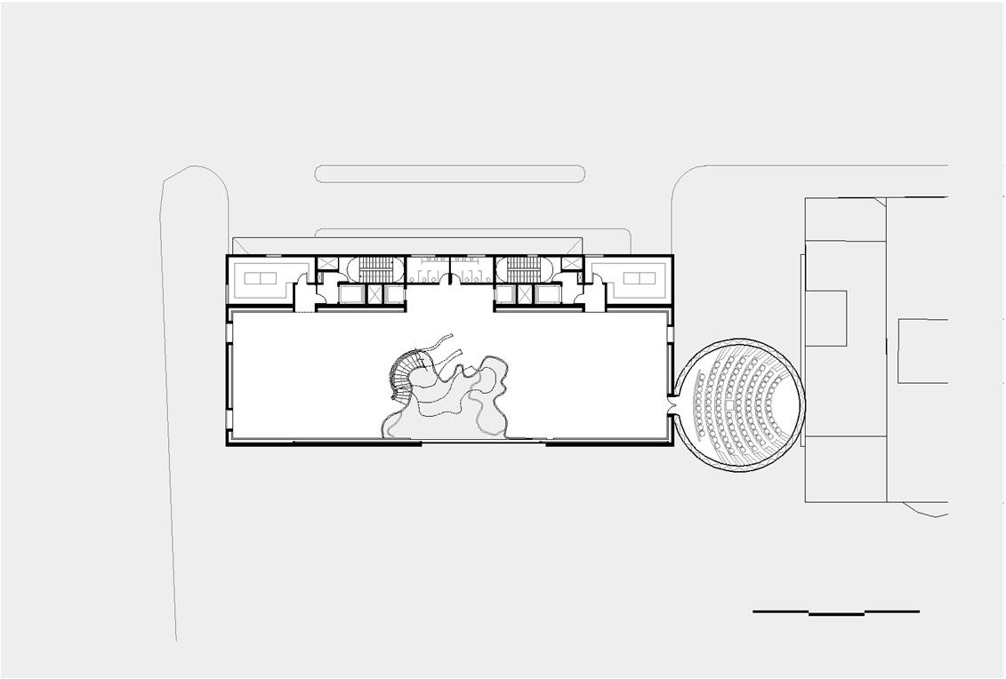 Exposições permanente e temporária, áreas administrativas e técnicas, auditório, restaurante, loja, café e mirante.