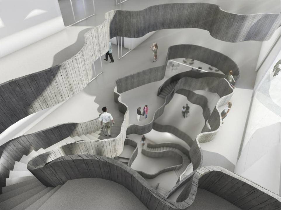 Ao adentrarmos o edifício, pelo hall do pavimento térreo, estaremos diante de um grande buraco, ou melhor, de uma seqüência de buracos a perfurar todas as lajes; buracos de diversas dimensões, formas livres e anômalas, que farão a comunicação visual interna entre todos os pisos e permitirão a compreensão imediata do funcionamento do Museu. Todo o edifício será em concreto armado, com um sistema estrutural extremamente racional e simples: lajes nervuradas apoiadas nas espessas paredes longitudinais.