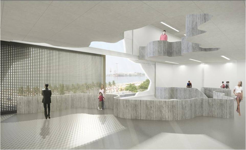 E sobre esta passagem, como que flutuando, uma esfera em aço brilhante abrigará o auditório de projeção múltipla. Será uma verdadeira escultura urbana, uma nova imagem intrigante e poética na orla de Copacabana, e também espelho de uma das mais belas paisagens da Cidade Maravilhosa.”