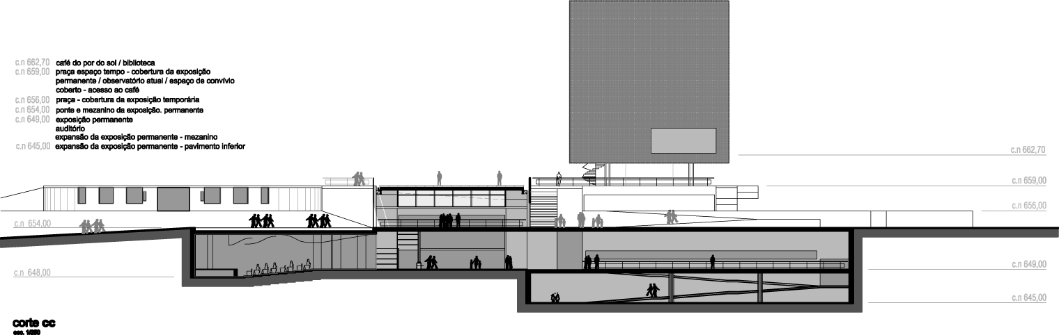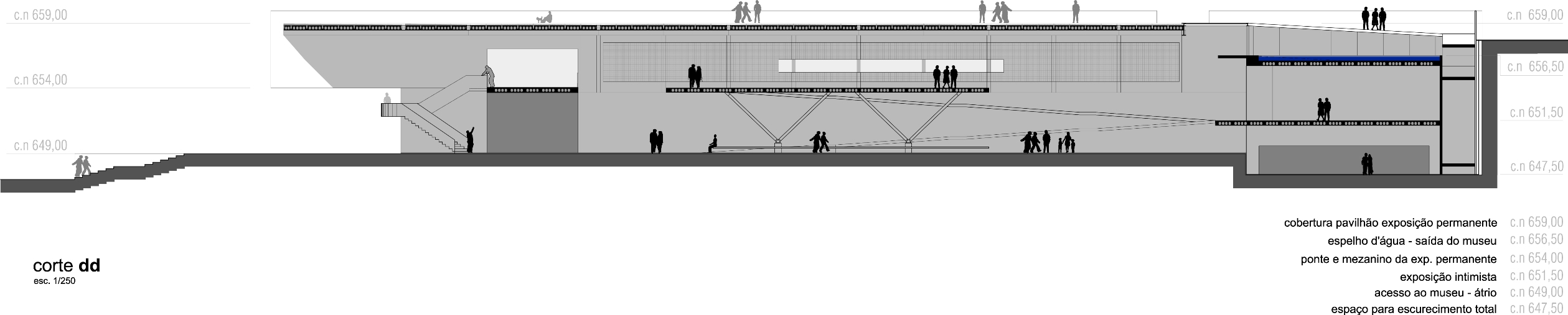 Esta circulação (livre e pública) percorre todo o terreno e adentra ao museu pelo o que chamamos de ponte (indicado na prancha 2/5 planta cota 654) sem, contudo interferir nos espaços e acessos às áreas expositivas, possibilitando assim que o Museu se integre totalmente ao terreno, seus jardins e praças.