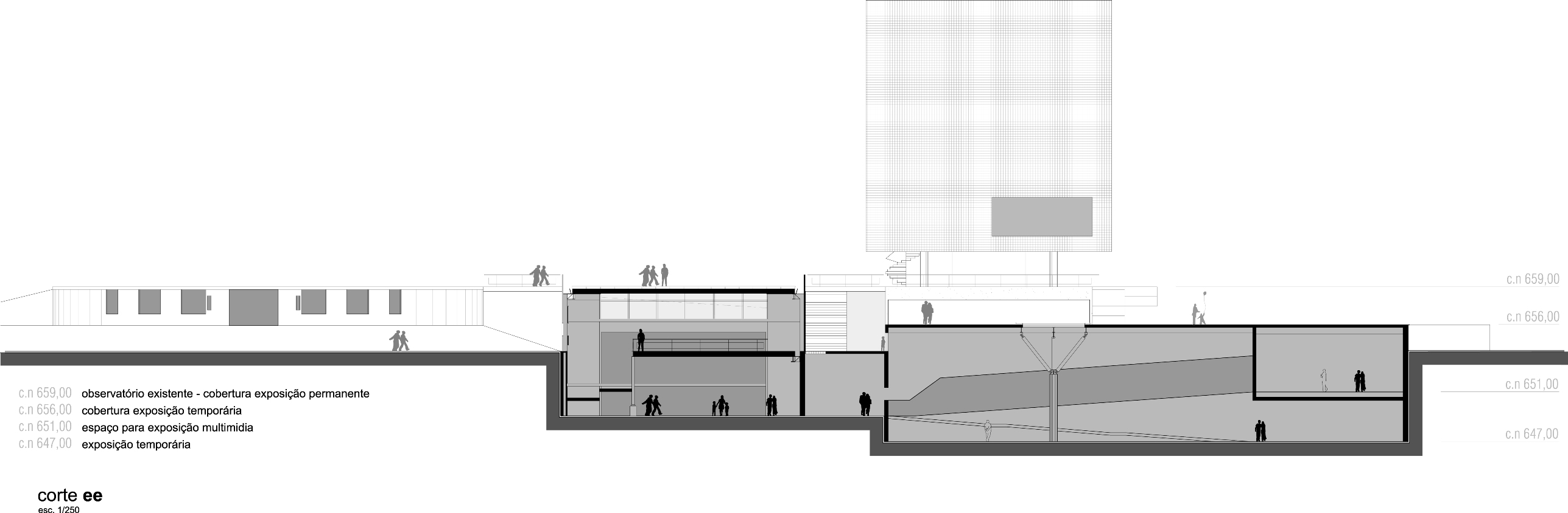 O mesmo sistema de rampas agora com pé direito reduzido, percorre o espelho d`água levando o visitante à cobertura do pavilhão de exposição permanente e através da explosão de luz criado pela abertura superior do edifício marcamos a saída do museu pela cota 659 – a mesma cota do antigo observatório – tendo a vista do poente e da cidade ao fundo, o cenário ideal para o término de todo o percurso de acesso controlado.