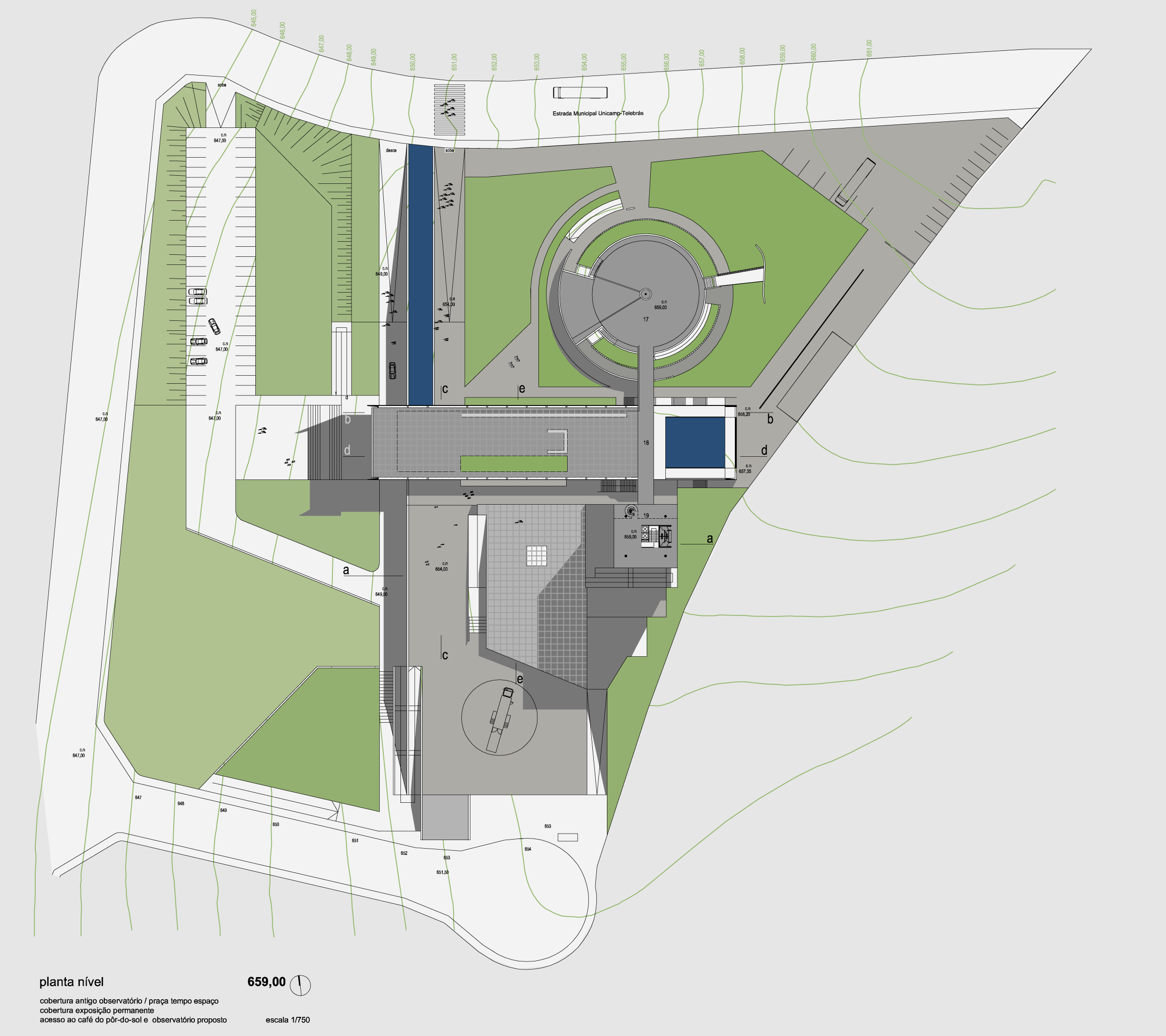 No entanto o uso proposto, e já dado, à cota do antigo observatório com a praça de exposição ao ar livre – tempo e espaço, é o que norteia esta proposta para o Museu Exploratório de Ciências na Unicamp. Este “chão” público é um importante elemento organizador não apenas dos acessos para o museu e suas áreas de exposições, mas também nos convida a adotar os platôs de coberturas do Museu como espaços utilizáveis e acessíveis garantindo a continuidade da praça tempo e espaço, prevista sobre o antigo observatório, para todo o terreno, conectando assim todos os lados da gleba através de uma circulação livre e pública.