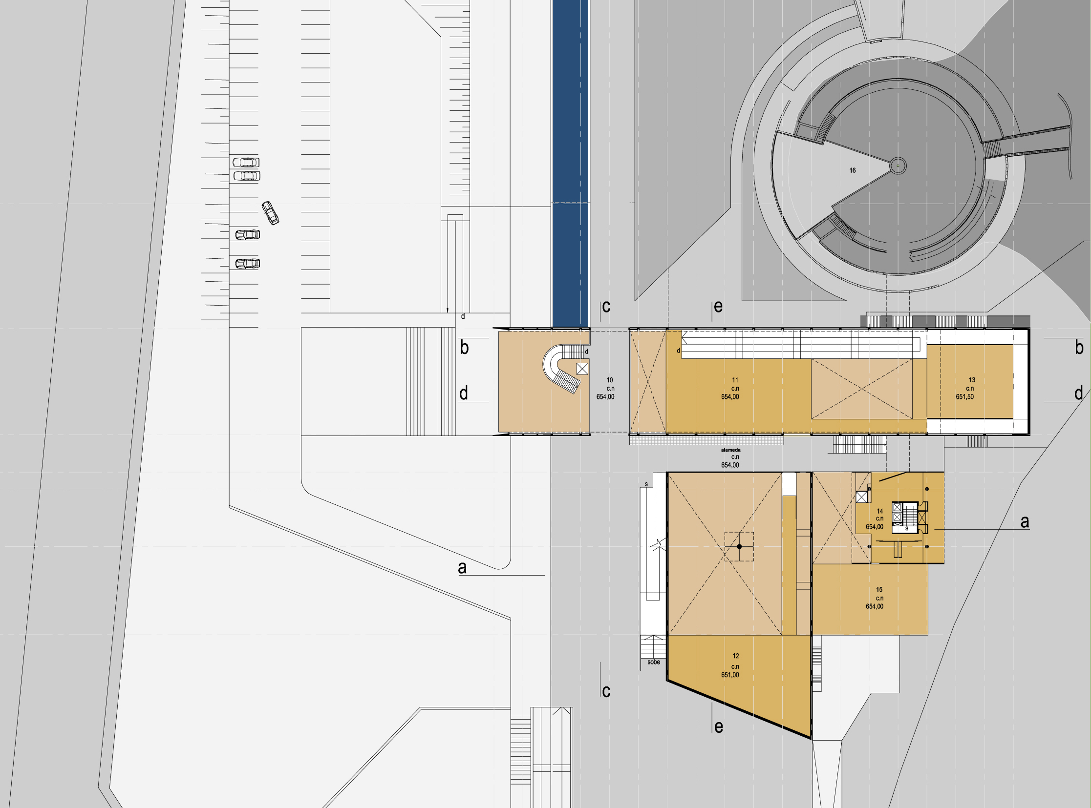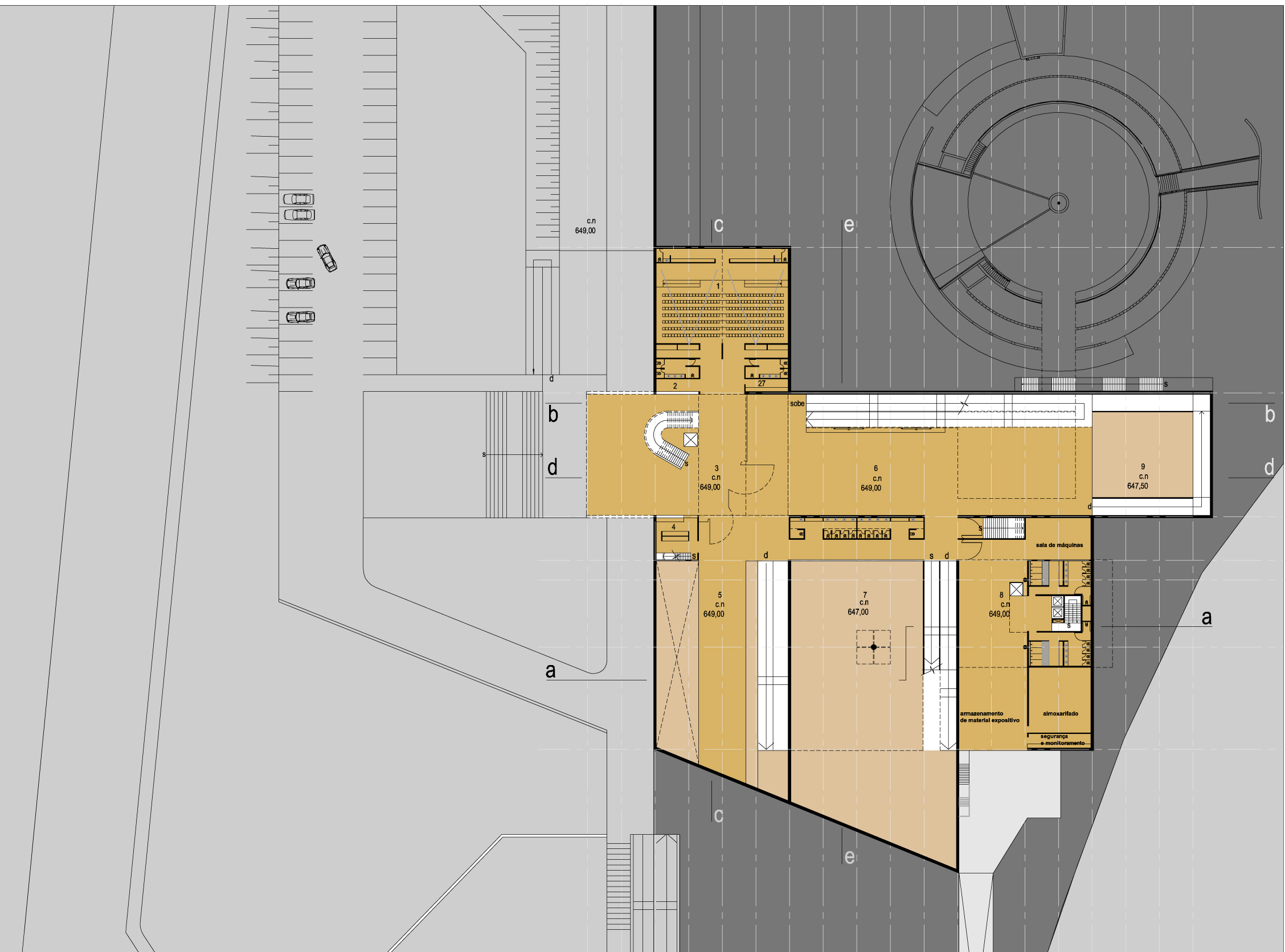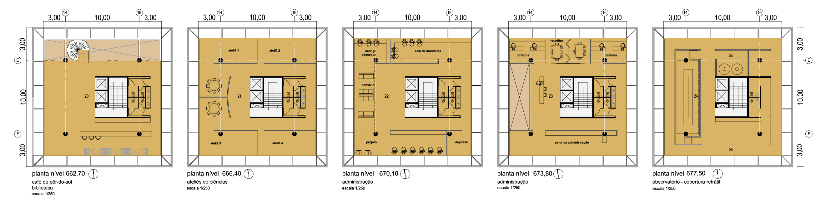 Este edifício, a partir da cota 659– cota de saída do pavilhão e do antigo observatório – transforma-se em uma grande área coberta para convívio, criada através da elevação do primeiro pavimento. As funções administrativas estarão distribuídas entre o terceiro e o quarto pavimento do edifício e os ateliers de ciências localizam-se no segundo pavimento do mesmo edifício.
