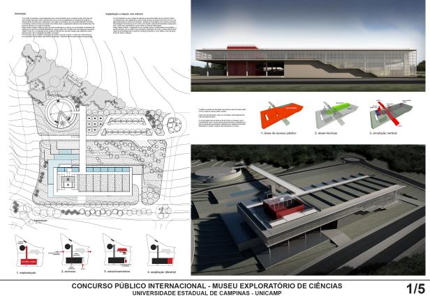 Veja abaixo o projeto da equipe composta por Alessandro Moreno Muzi, Hernani Carvalho Paiva e Luiz Marino Küller, finalista e menção honrosa no Concurso Internacional para o Museu Exploratório de Ciências da UNICAMP.