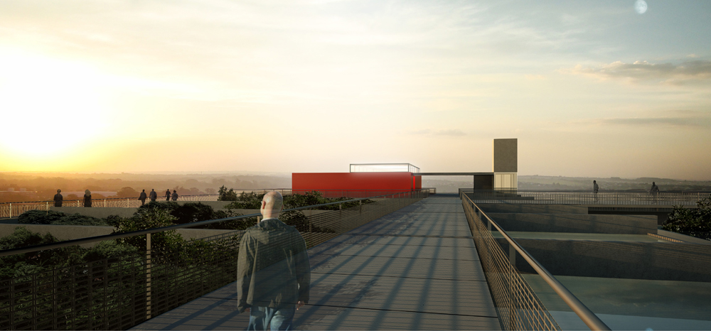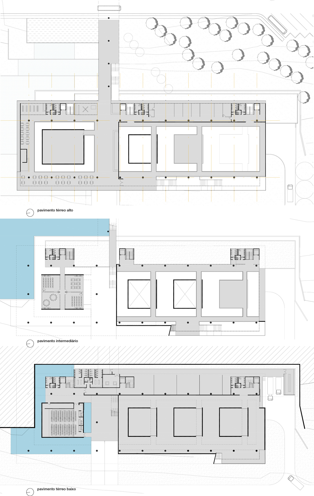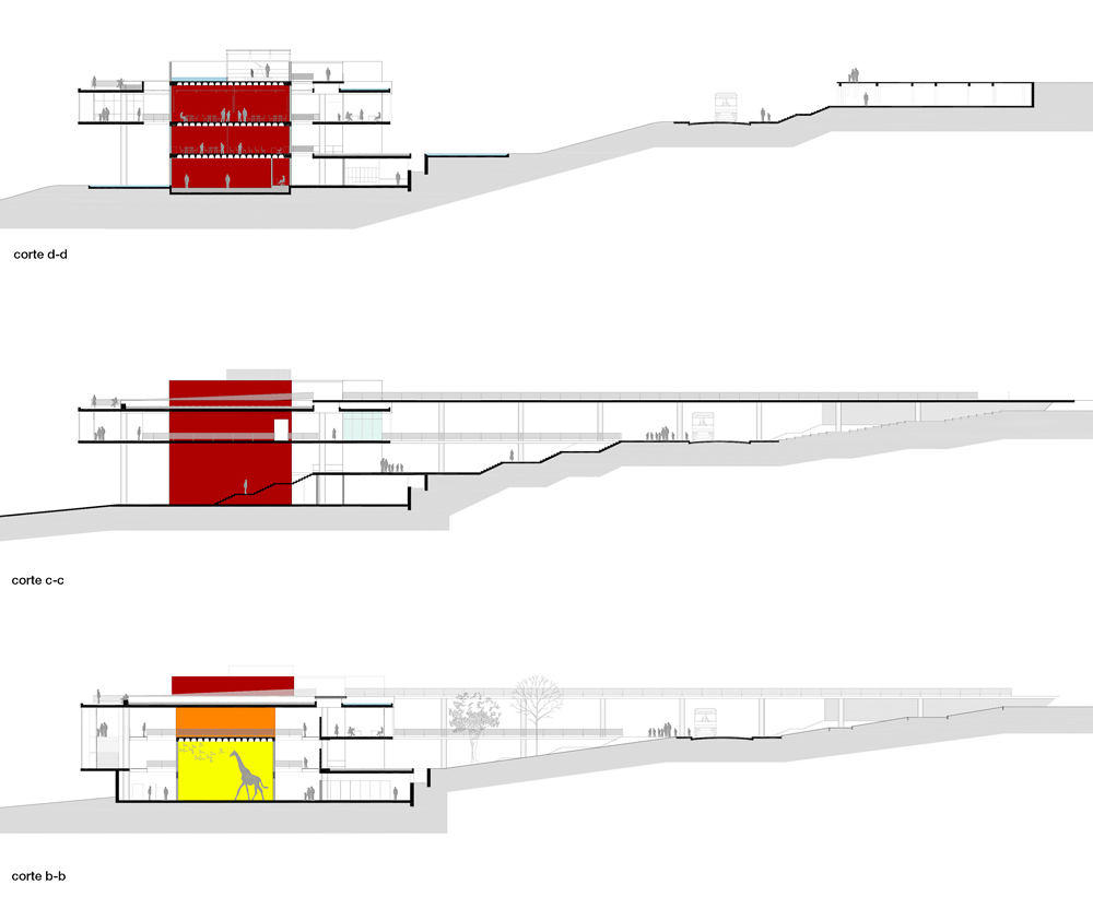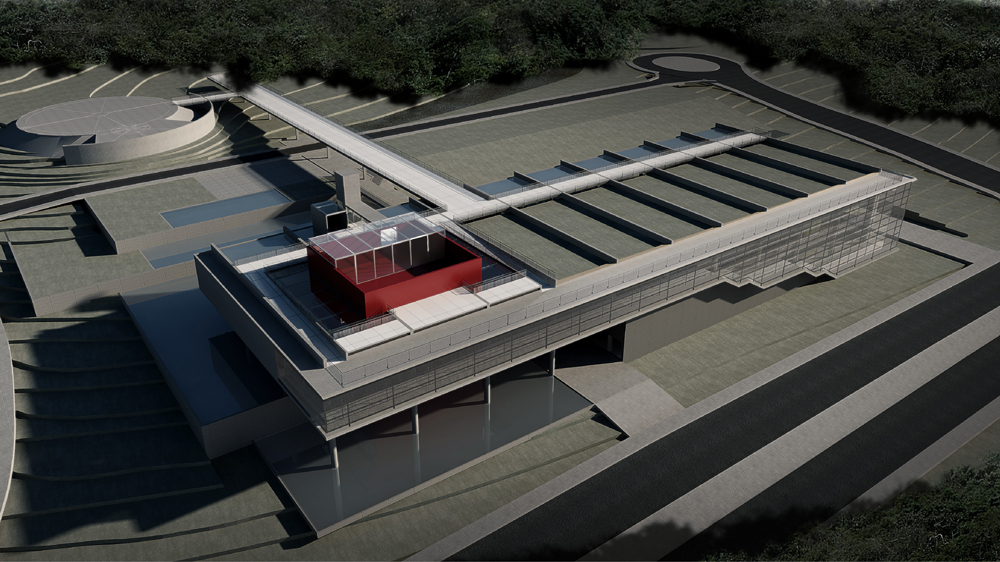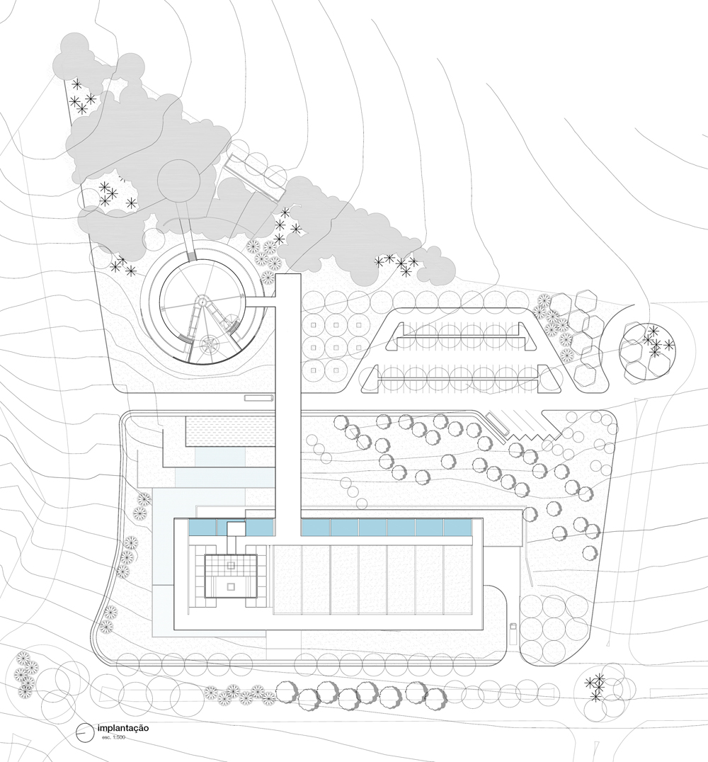É proposto um novo eixo de organização do terreno do museu existente, de modo a unificar através de dispositivos espaciais e paisagismo as construções existentes (praça do tempo e espaço e administração) e o novo edifício.