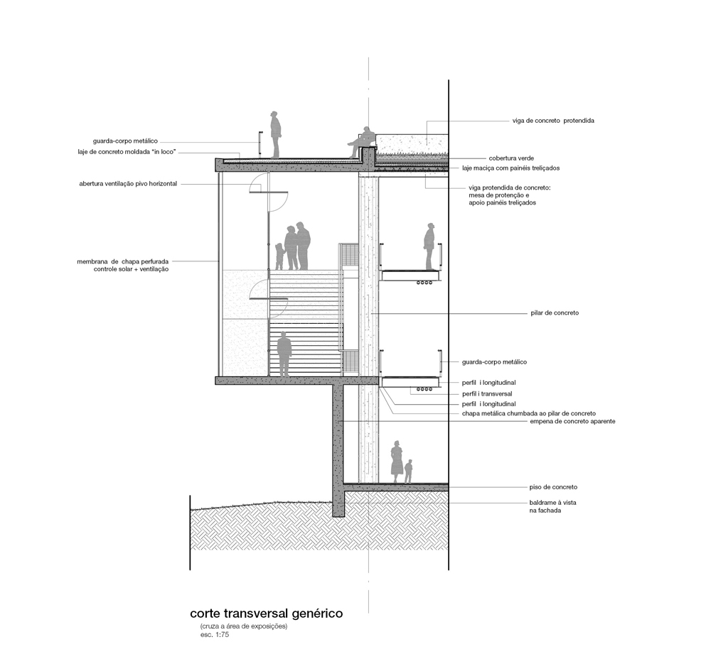 Em um dos extremos, esta viga forma um balanço que atiranta parte da laje do pavimento inferior – este balanço mais o tirante ajuda a melhorar a performance da viga, balanceando os momentos resultantes do carregamento no centro do vão e consequentemente diminuindo a seção da viga. Estas vigas protendidas também terão capacidade para carregamentos pontuais, a serem utilizados em exposições diversas.