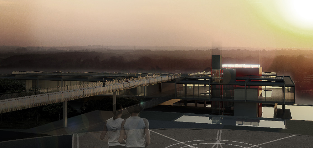 Como um sistema à parte, permeando esse cenário descrito acima de coerente rigidez, existem as passarelas metálicas, permitindo fluxos diversos e experiências de percurso e de relação do público com o ambiente.