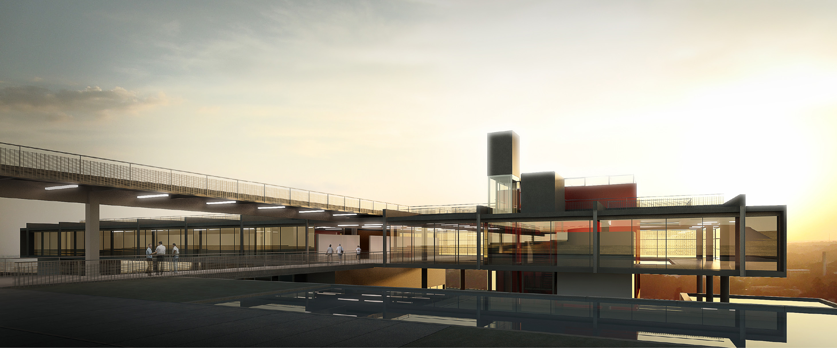 Dentro deste contexto – isolamento de um contexto urbano e predominância topográfica – o partido adotado cria um edifício auto-suficiente, implantado de modo a manter este domínio visual da universidade tanto a partir da cobertura proposta no novo edifício como da futura Praça do Tempo e Espaço.