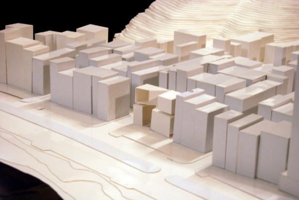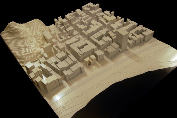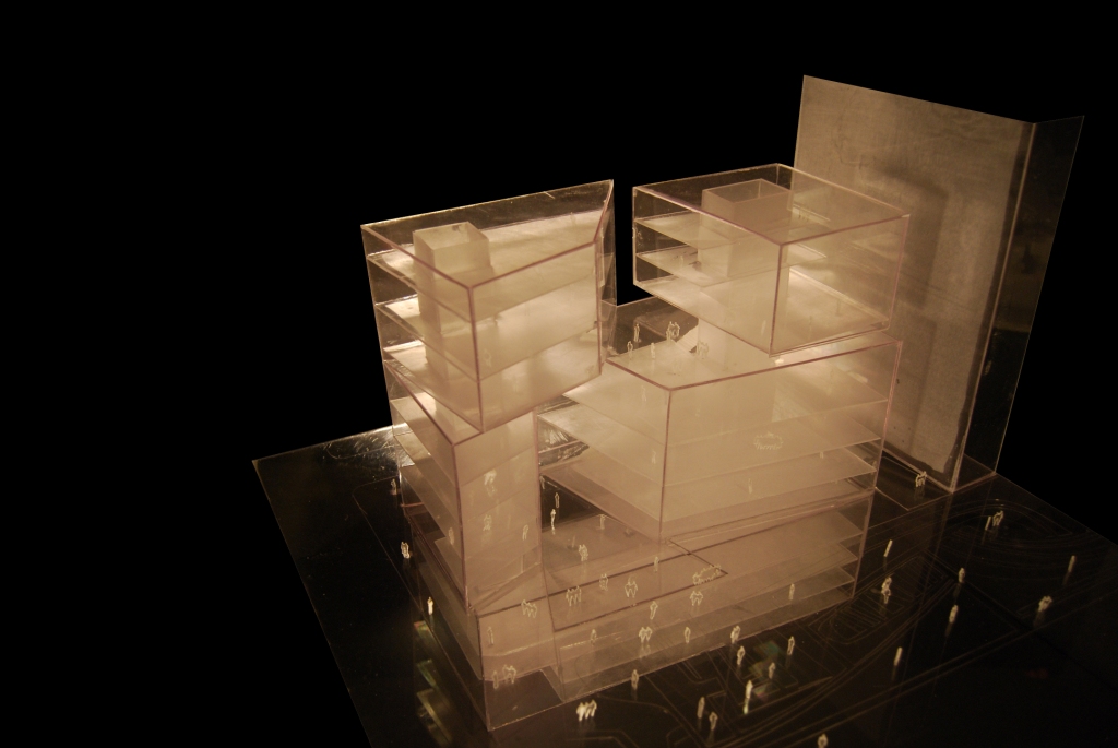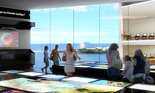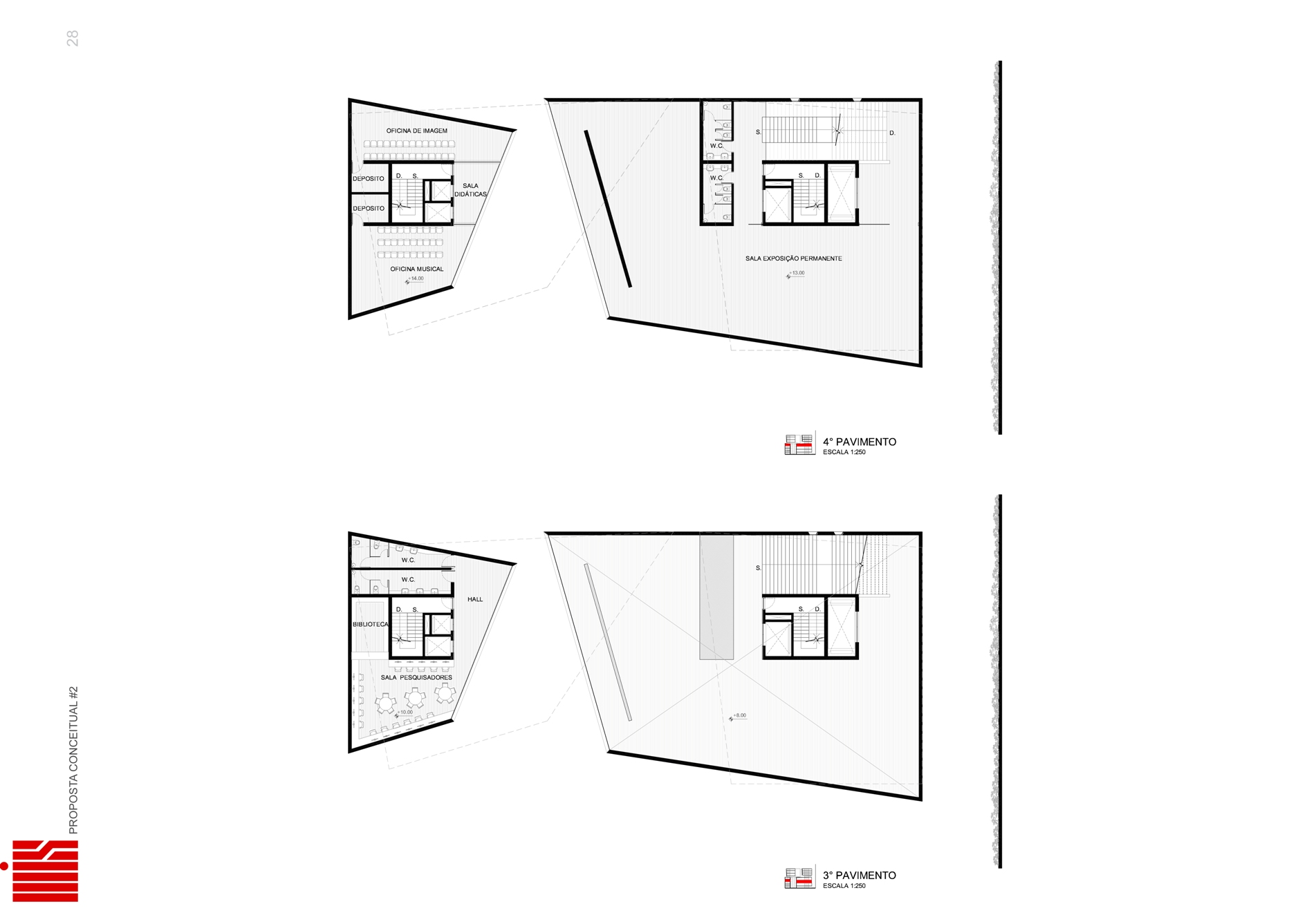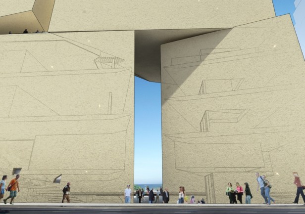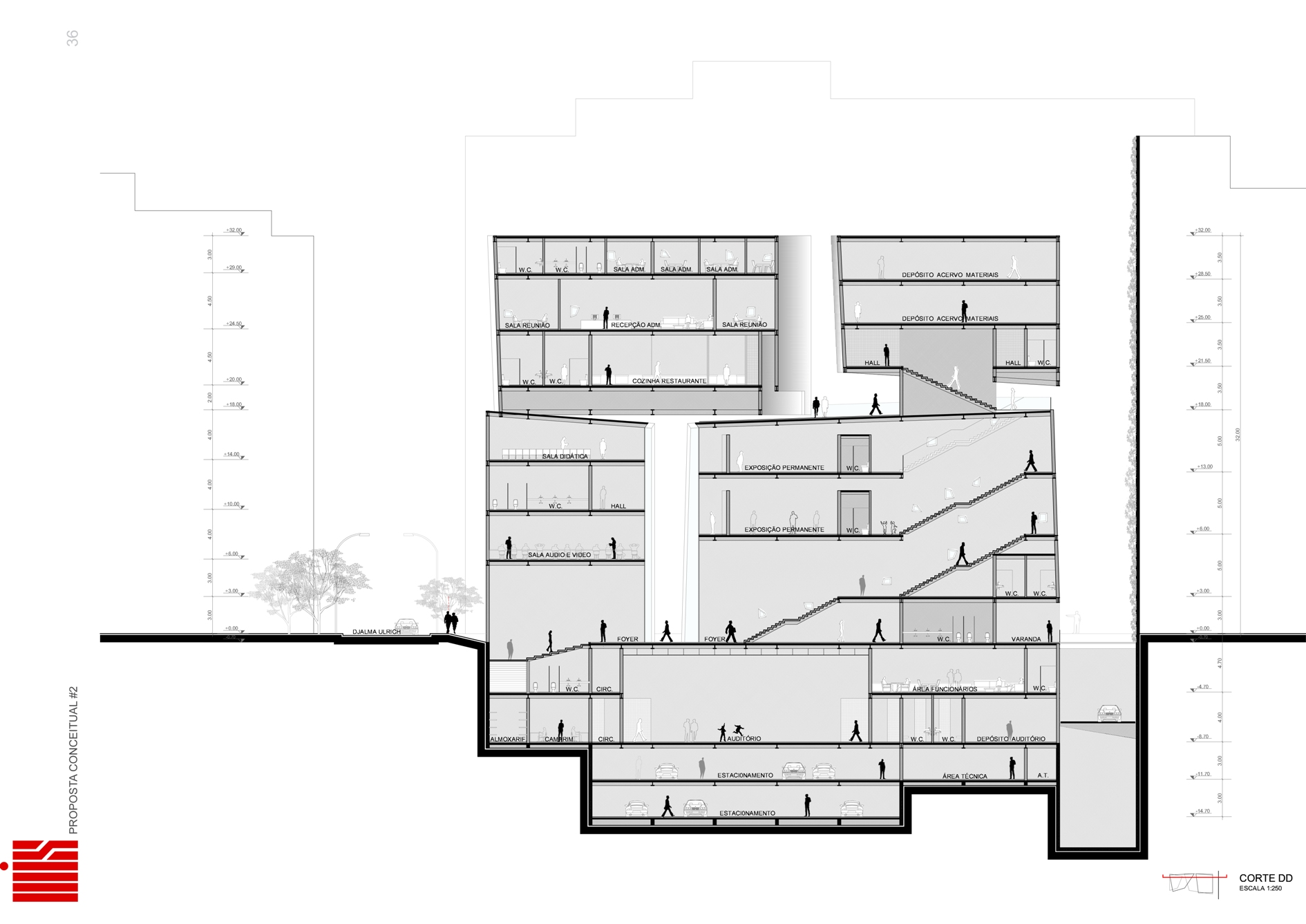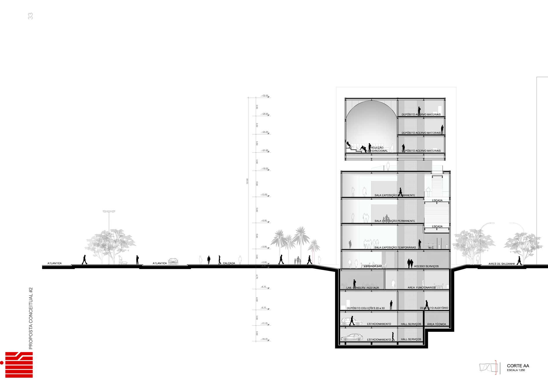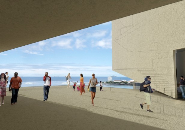 Empilhamos o museu na forma icônica de um corpo estranho, primitivo, capaz de induzir novas visuais e enquadramentos pelo simples posicionamento do visitante em ângulo oblíquo ao mar, assim como de tornar arquitetura e cidade permeáveis, híbridas, pela ruptura da lógica frente e fundos, dentro e fora do lote.