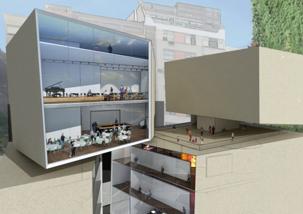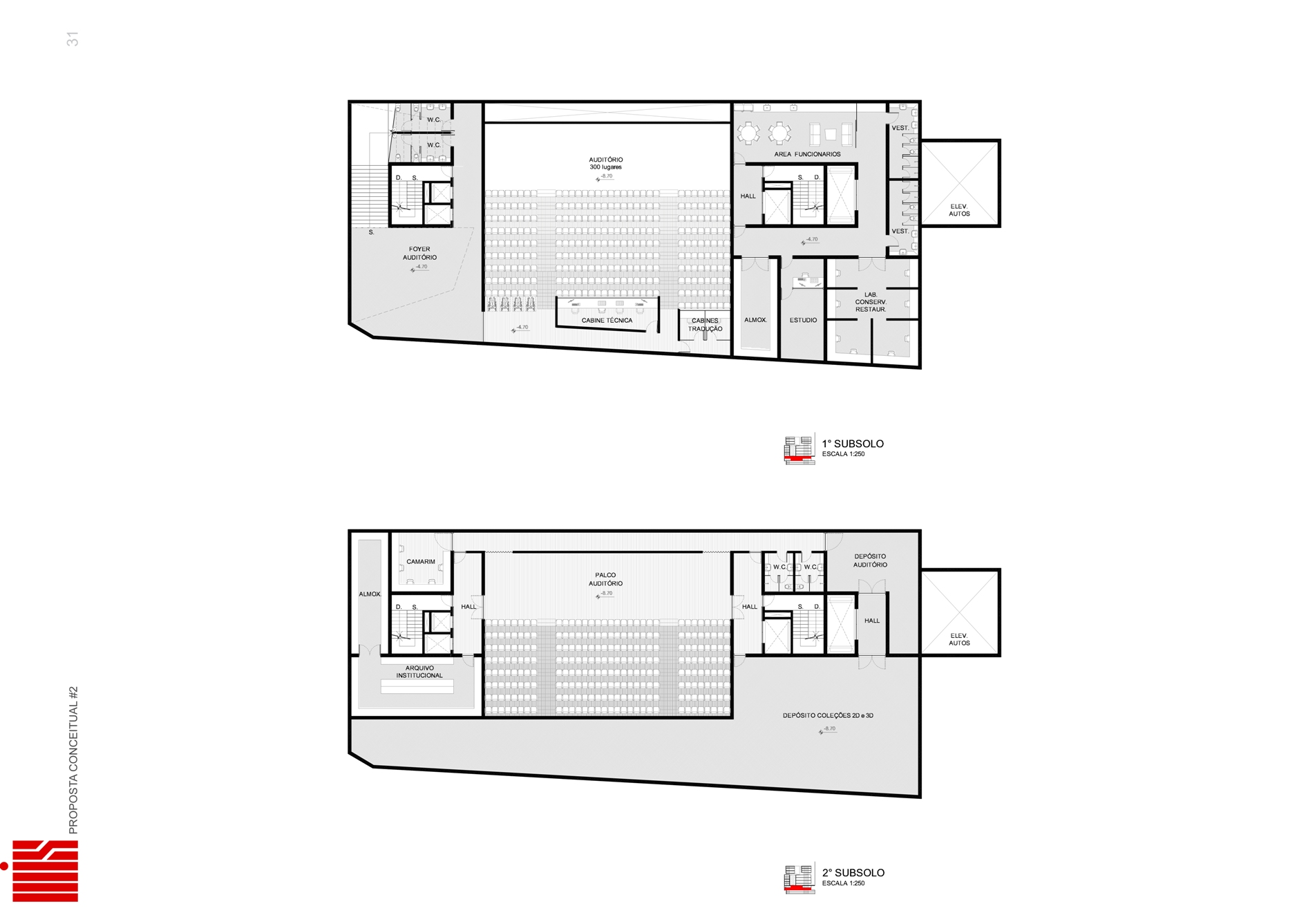 Não entendi como prática a separação quase completa em dois blocos, pouco funcional. Tenho algumas dúvidas se o formato da sala de projeções multidirecional é o mais adequado, mas confesso minha ignorância na área…