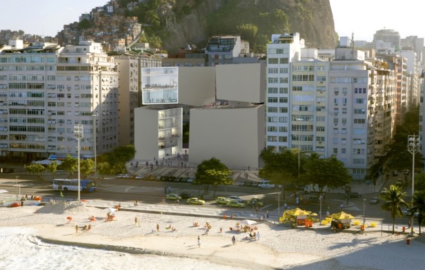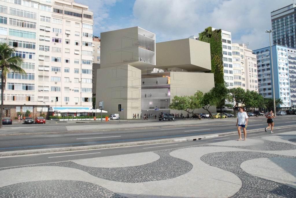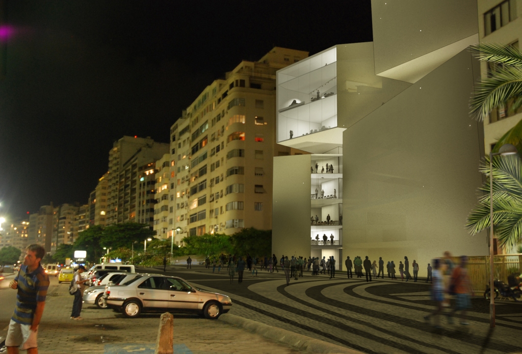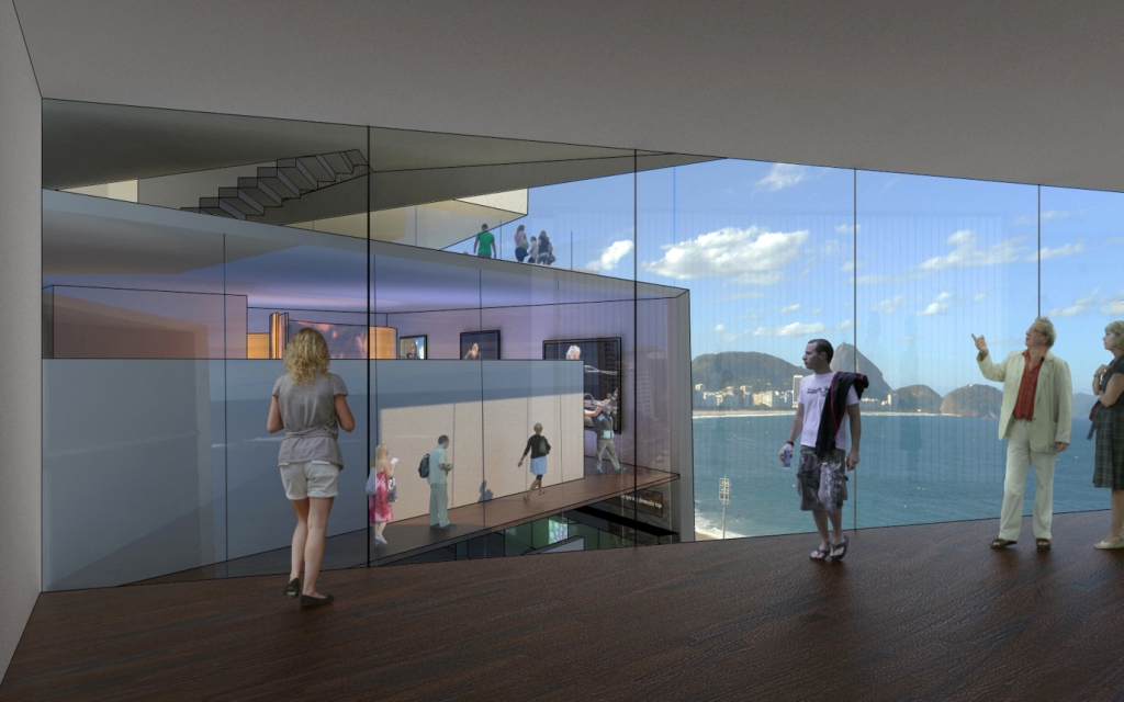 . Facetamos os blocos para criar enquadramentos inusitados da paisagem, como os que apontam, desde as varandas internas das salas expositivas, para a extremidade sul da praia de Copacabana;