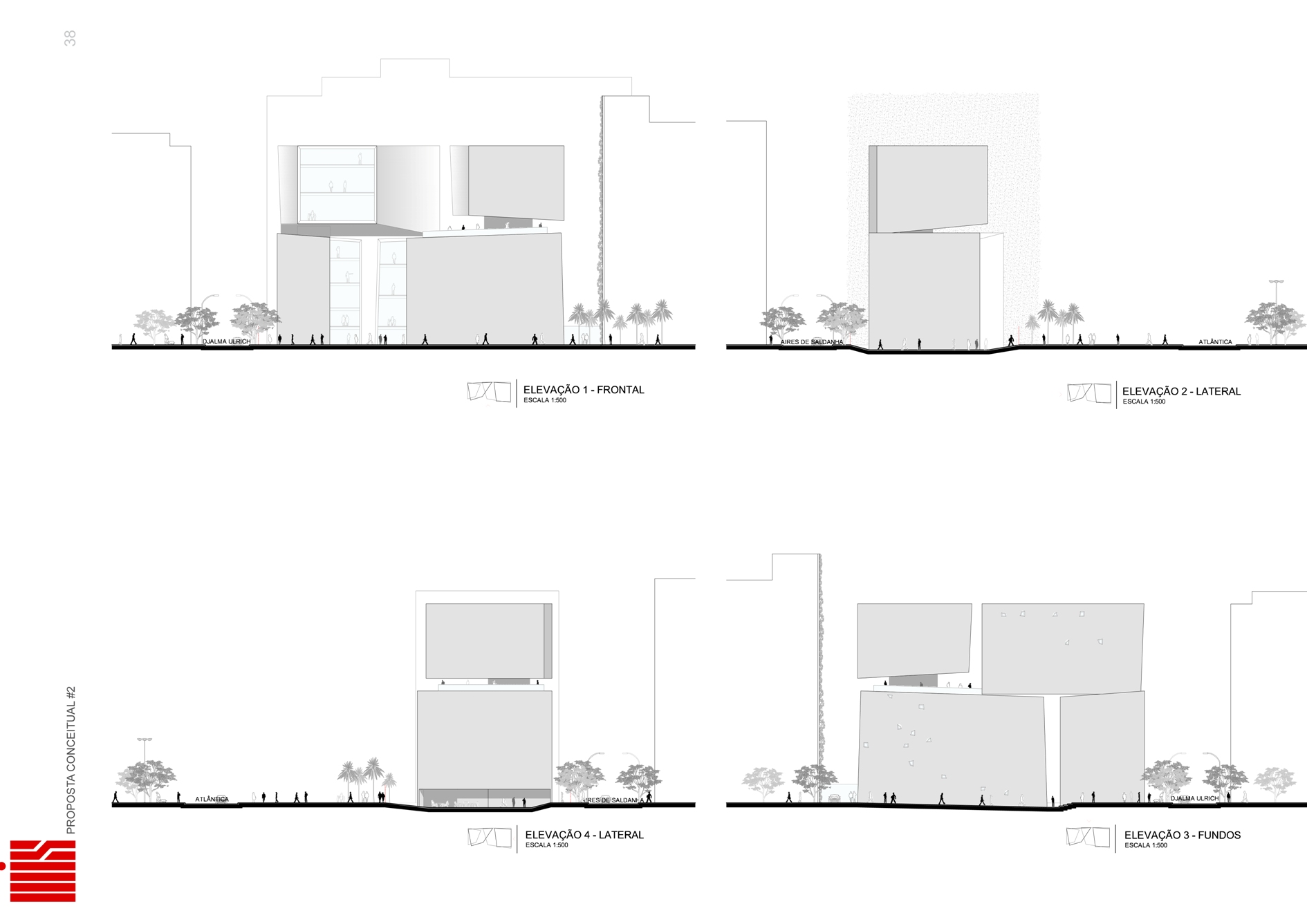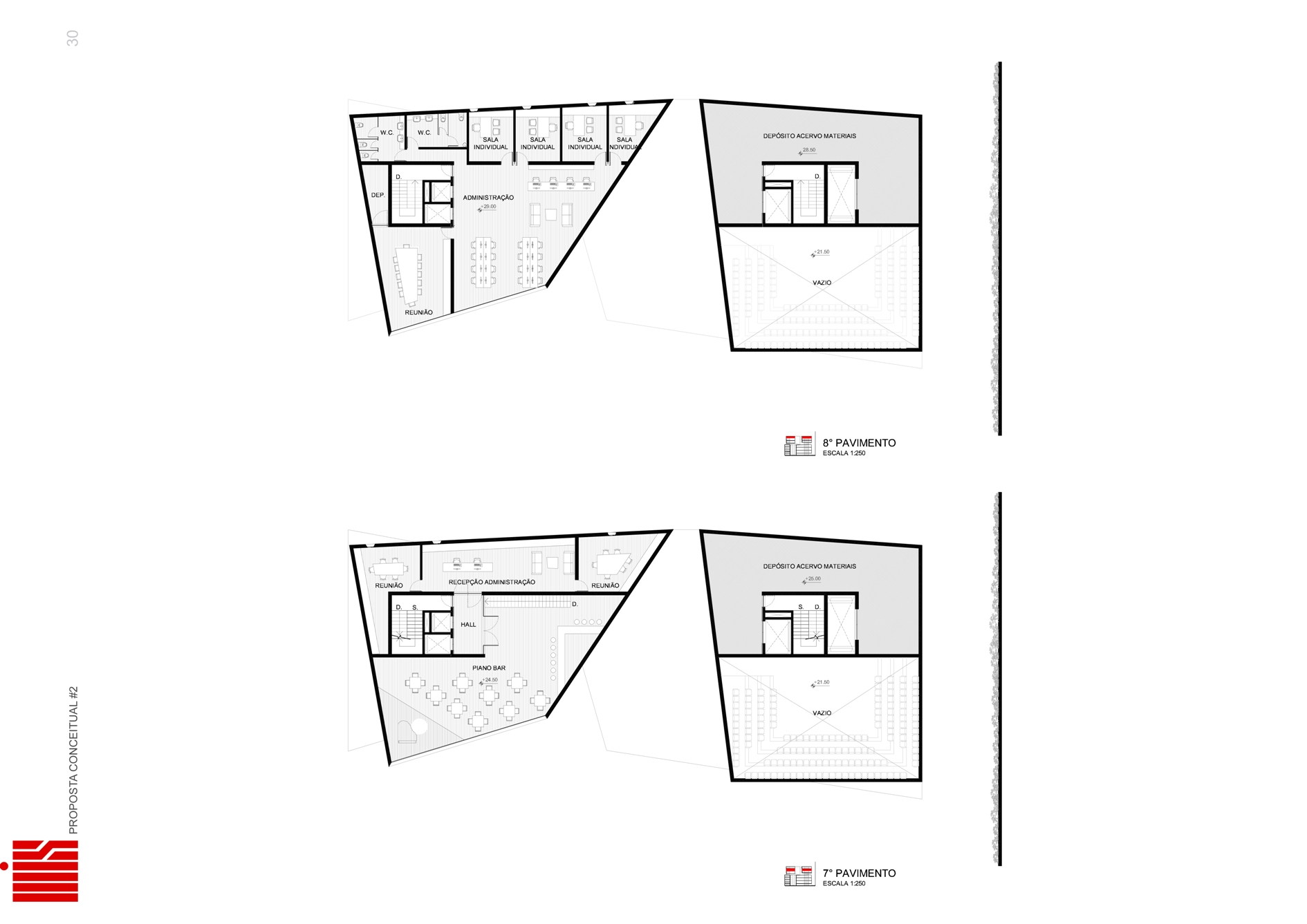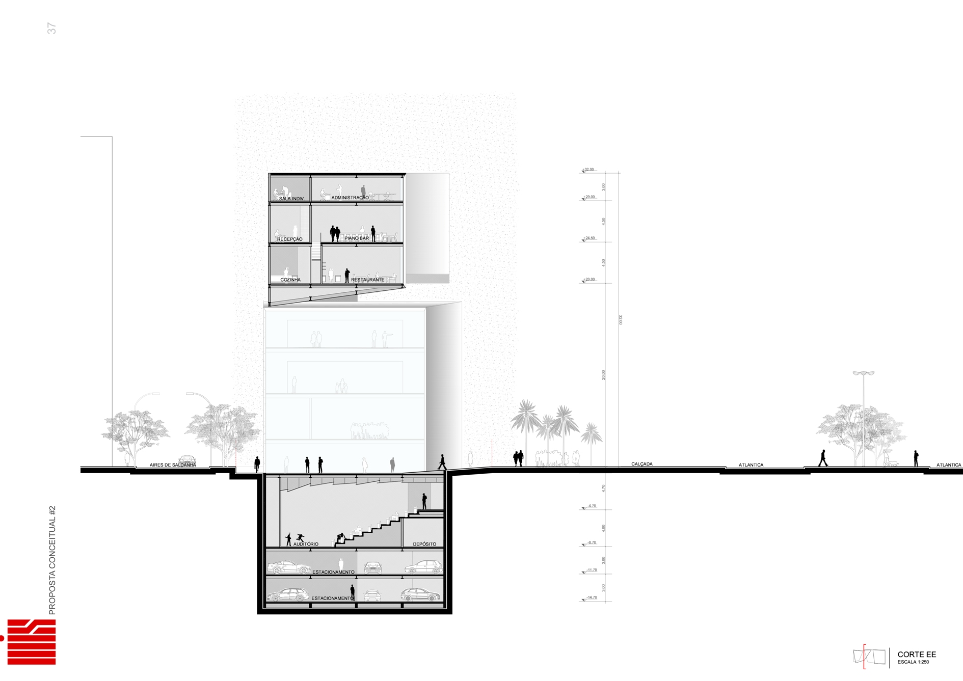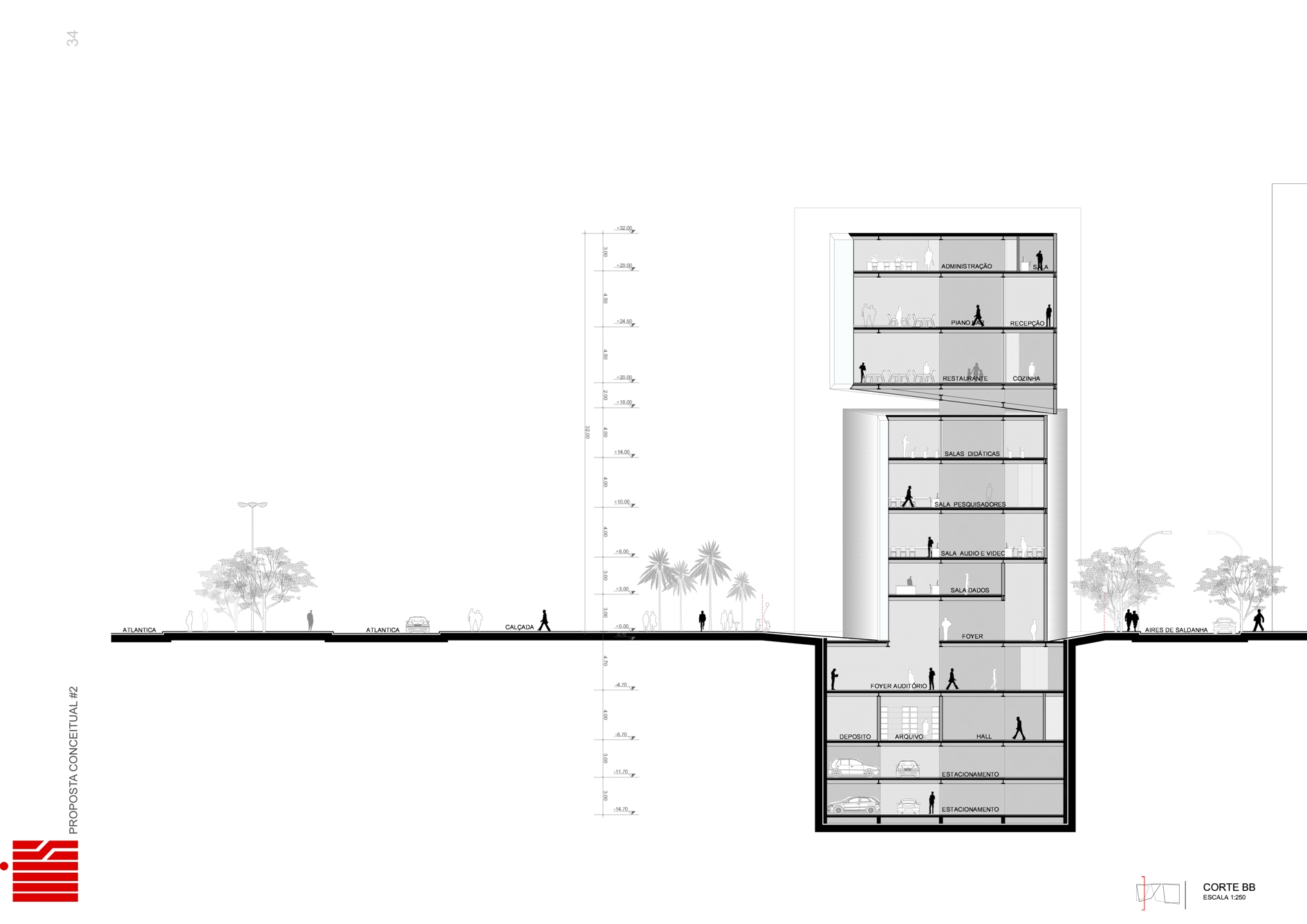 Propomos, ao contrário, a implantação não linear, a interiorização do semi-público para além dos limites restritivos das calçadas, horizontal e verticalmente, na medida das potencialidades do programa. Para isso, nos valemos da setorização em blocos relativamente autônomos, embora inter-relacionáveis, procedento sua cuidadosa organização no espaço a fim de criarmos os fluxos e locais estratégicos de transição que qualificam o projeto.