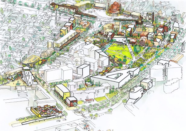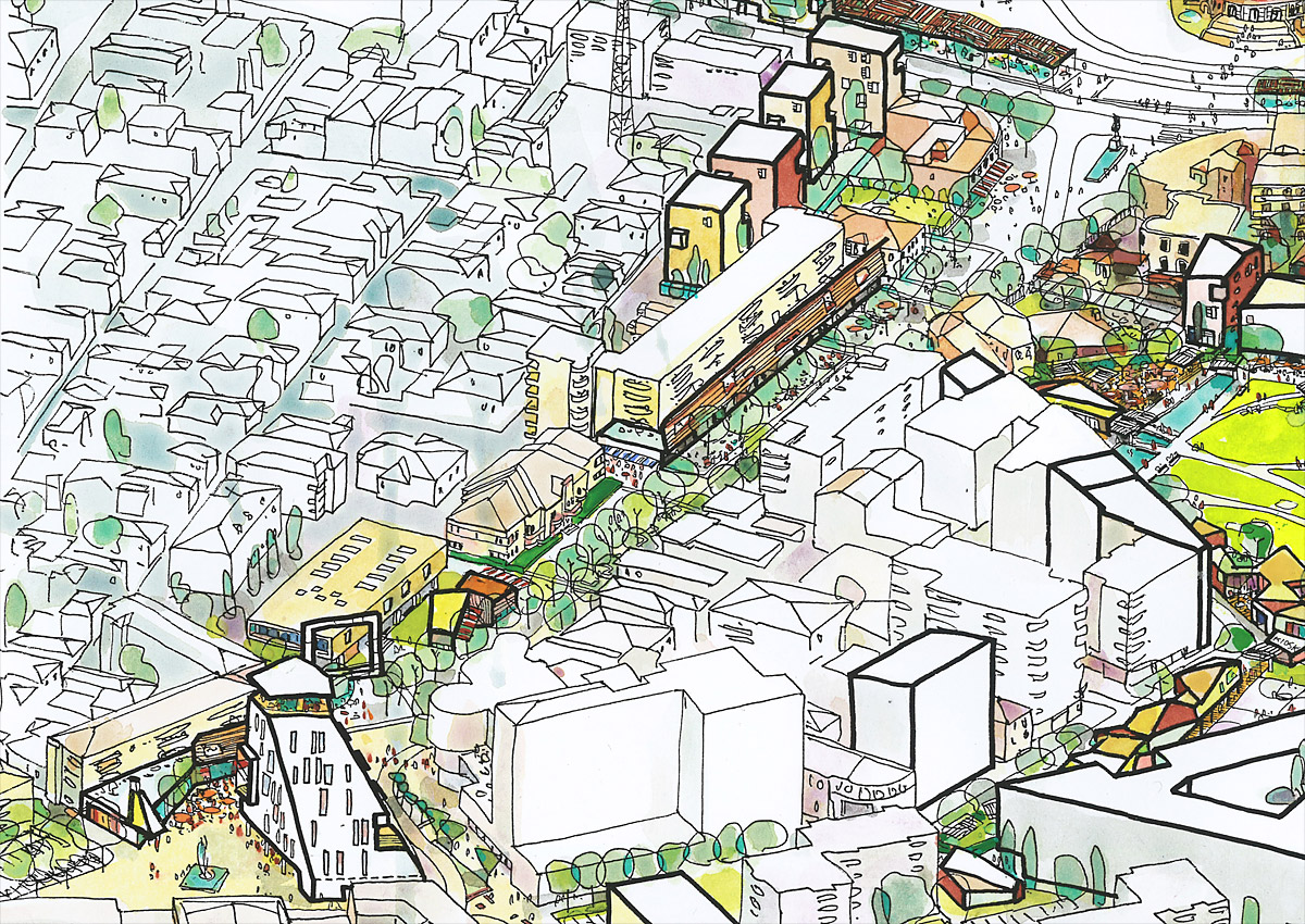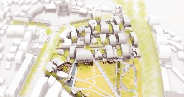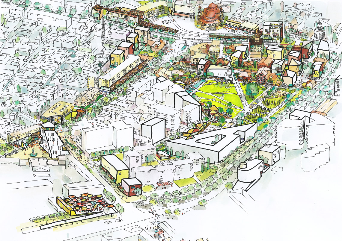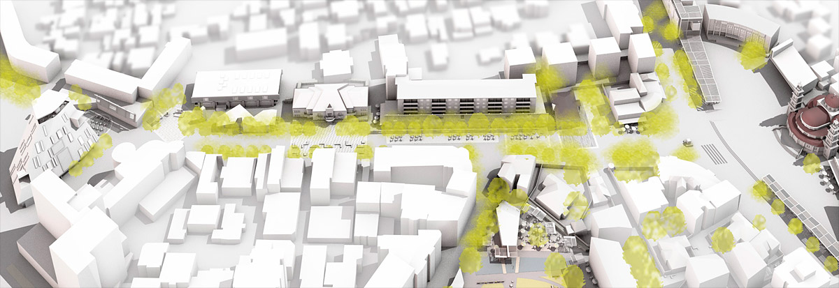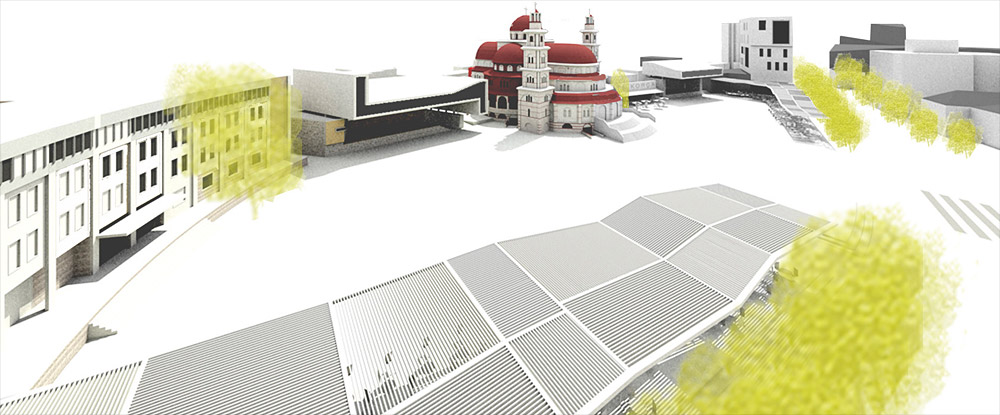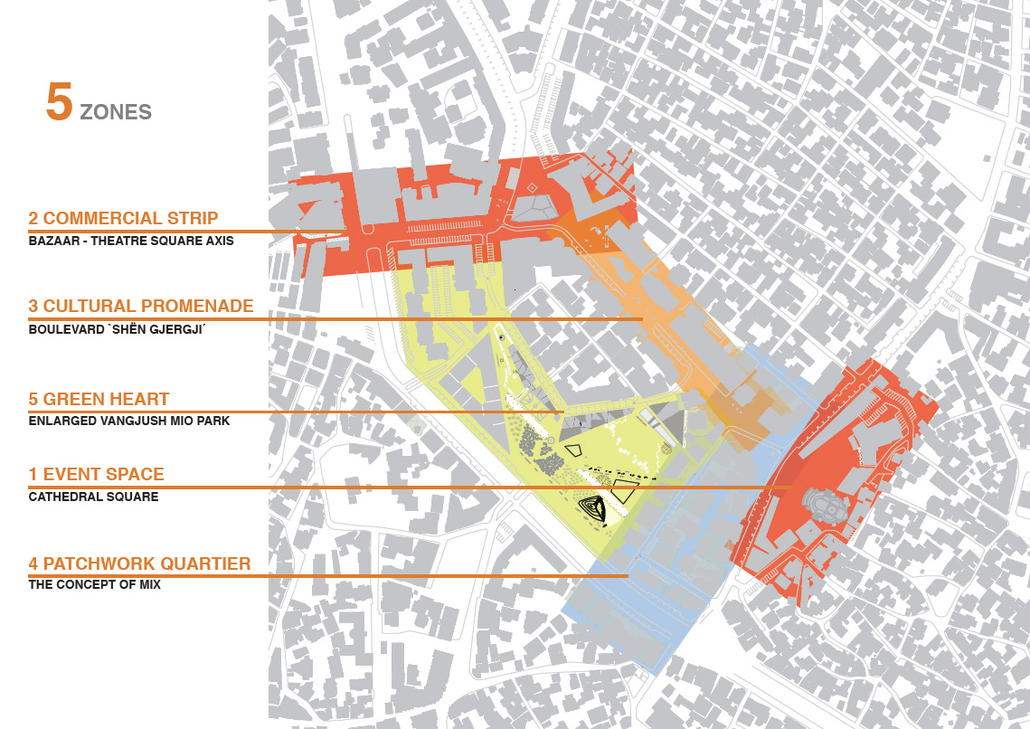 O conceito central do projeto é definido a partir de 5 zonas, que caracterizam os 197.000m2 da área central: comercial, cultural, núcleo verde, espaços de eventos e a combinação de usos dos “retalhos urbanos” que marcam alguns trechos do centro urbano. Juntas, essas zonas definem uma nova rede de espaços públicos. A catedral, em um dos extremos, se destaca como uma “âncora” cultural e patrimonial para o desenvolvimento urbano do conjunto. No outro extremo, um centro comercial é inserido como contraponto e pólo de concentração, criando-se entre os dois pólos um boulevard cultural e comercial.