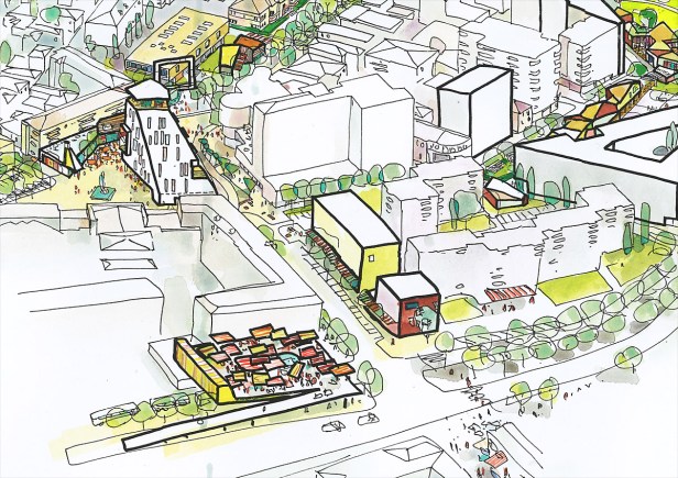 Os autores do projeto vencedor definem o conceito do projeto como “Urbanismo Cenográfico”, como uma espécie de “coreografia de novos edifícios e espaços públicos, que se baseiam nos elementos existentes e no potencial de uma cidade pequena, porém espacialmente complexa.”