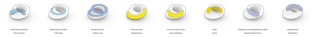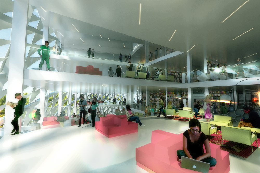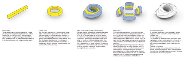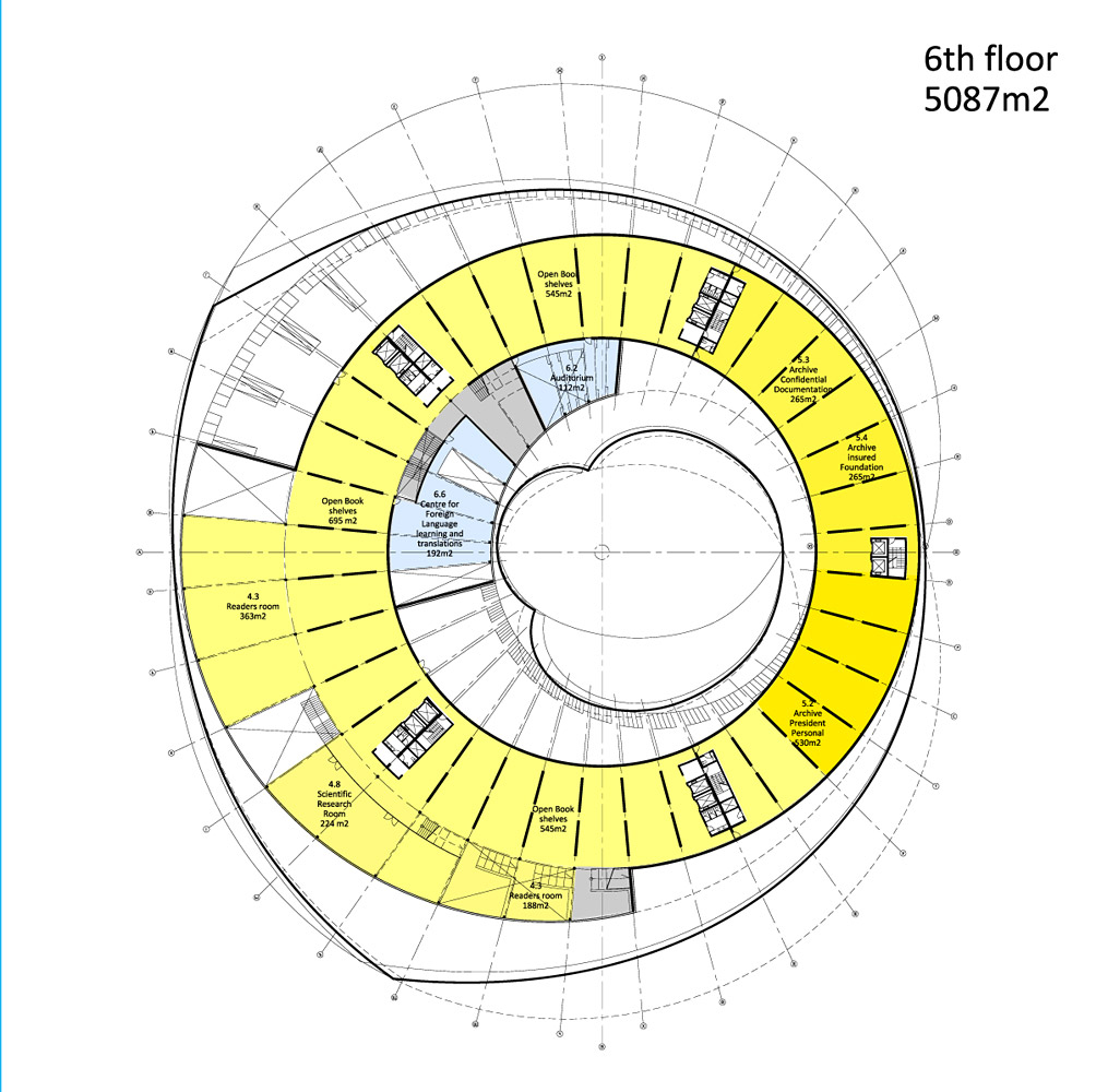 Segundo os arquitetos, “o arquivo é organizado de forma circular, como um “ciclo do conhecimento”, cercado por luz e ar dos dois lados. A idéia do círculo permite uma orientação intuitiva em relação à grande e crescente coleção de livros, revistas, filmes e diversos tipos de mídia. Assim como na “fita de Mobius” (um espaço topológico caracterizado pela torção da superfície), o programa voltado para o público se movimenta do interior para o exterior, da base para o topo, proporcionando perspectivas espetaculares sobre o entorno e sobre o panorama da cidade em crescimento”.