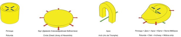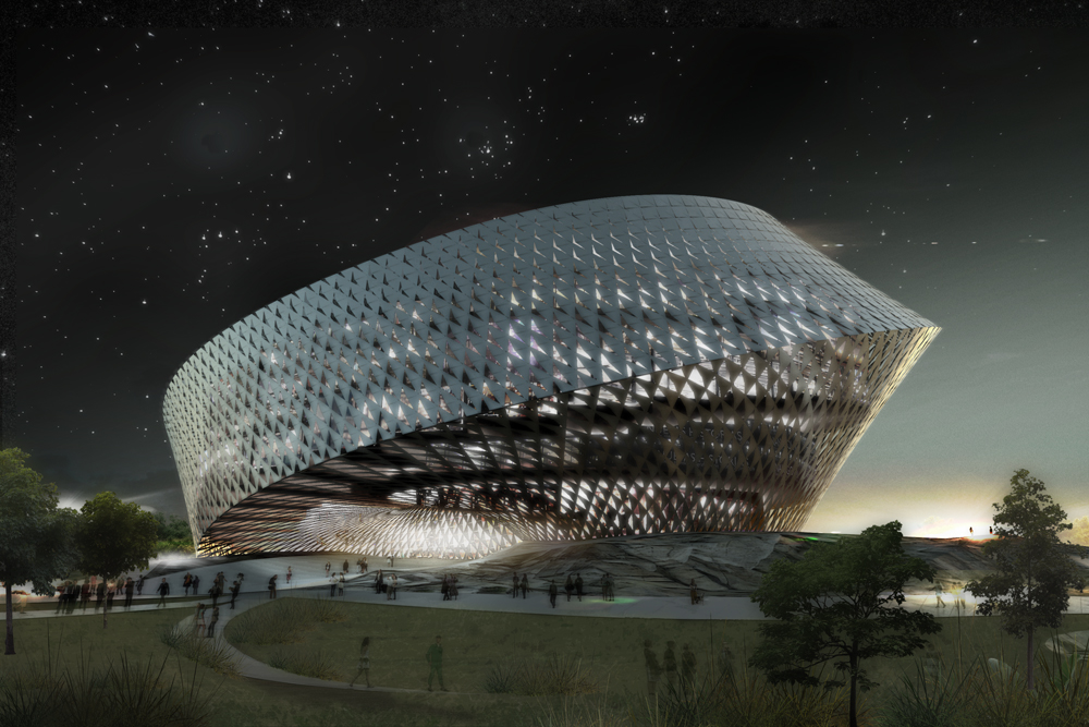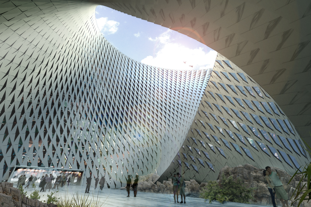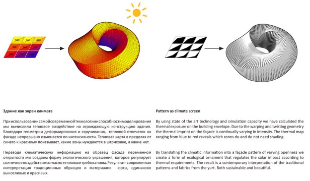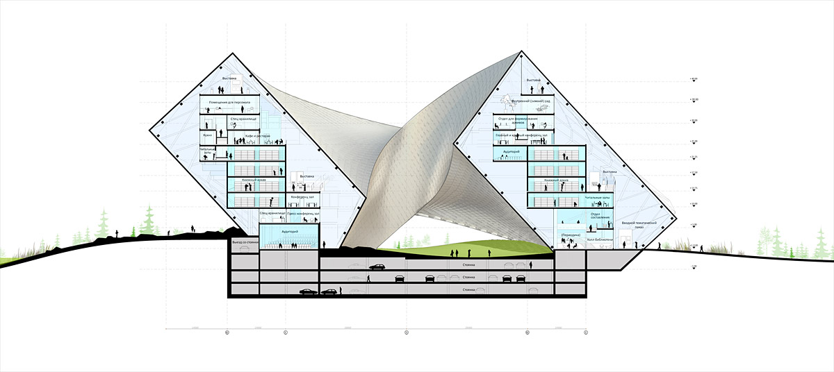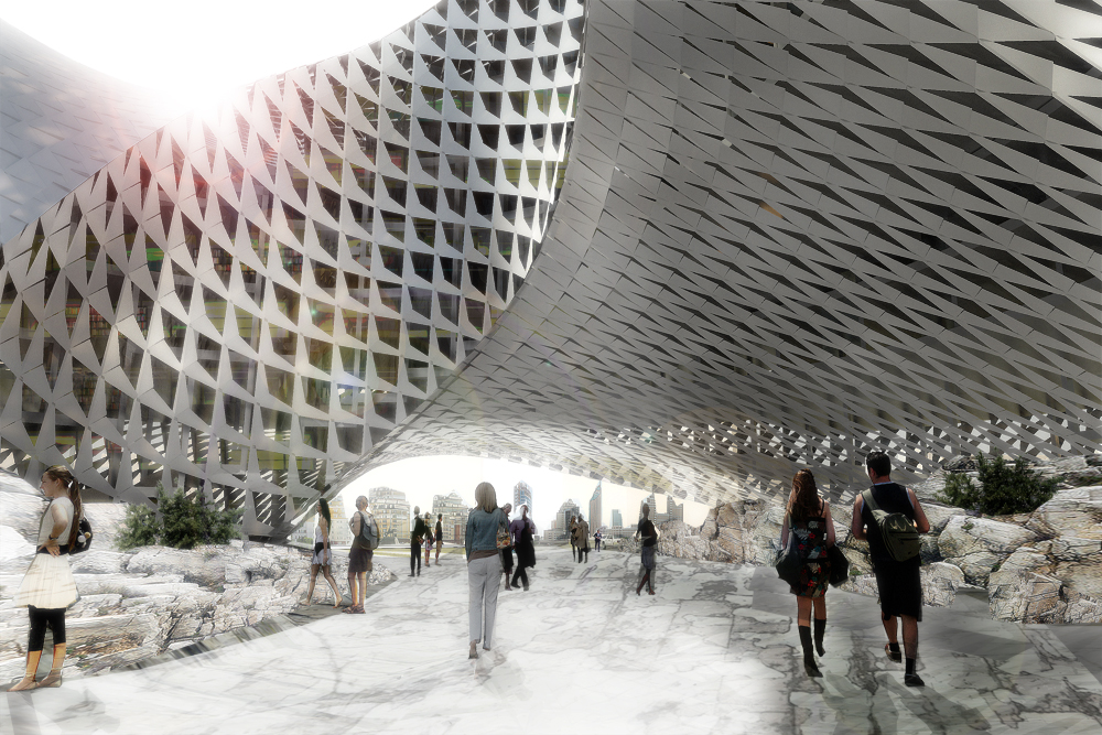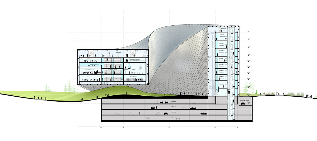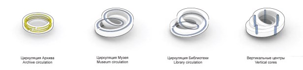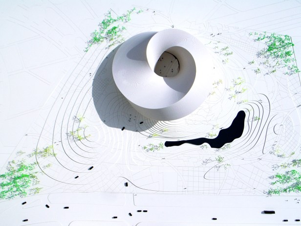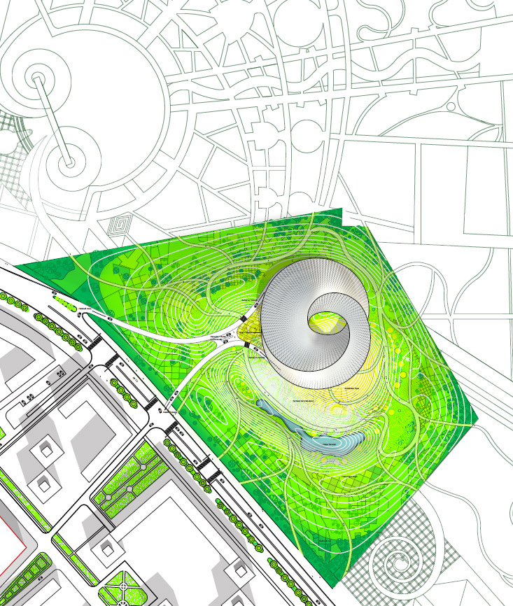 “São duas estruturas articuladas: o círculo e o espiral, criando um edifício que sai da organização horizontal e parte para a organização vertical dos espaços, em sobreposição e ao mesmo tempo por meio de organização diagonal. O resultado é uma combinação de hierarquia vertical e conectividade horizontal, somadas a perspectivas em diagonal. Essa composição e combinação de espaços é coberta por uma pele contínua, que se forma como uma “fita de Mobius”, na qual as fachadas se movimentam de dentro para fora e vice-versa.”