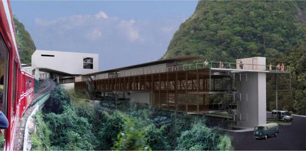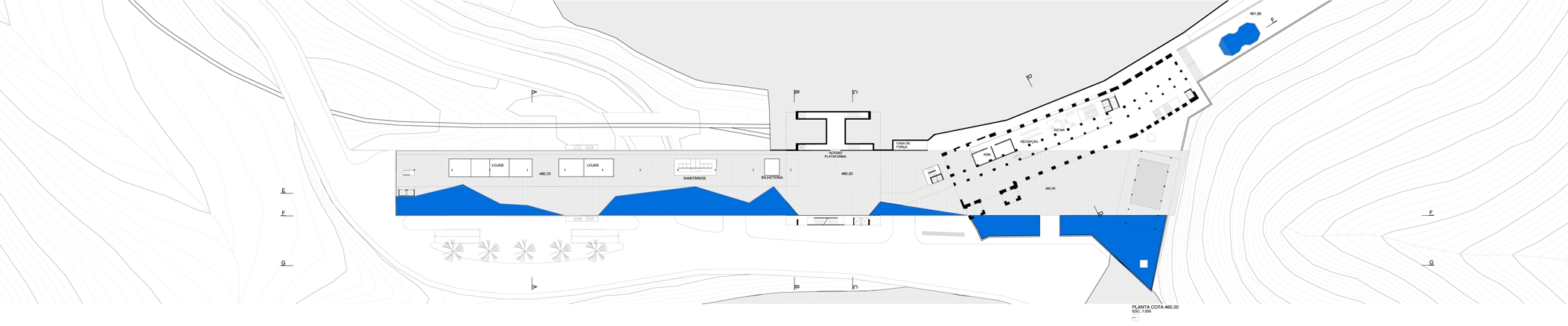 Posicionada na cota 760,20, sua cobertura toma o nível do pavimento térreo do hotel como referência, criando um espaço aberto mas protegido, capaz de abrigar o comércio, os sanitários públicos, a bilheteria e o acesso à estação de trem.