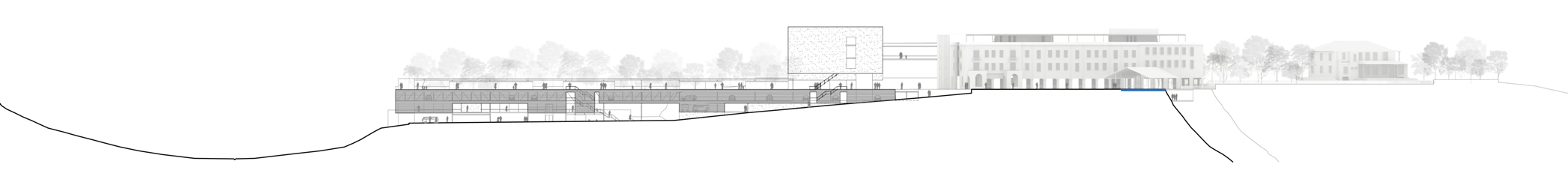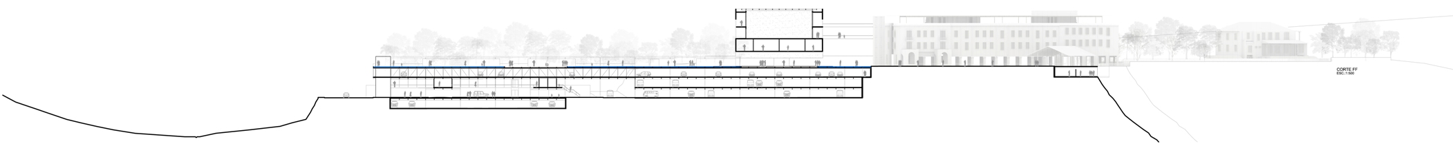 Tirando partido da inclinação da platéia do auditório, a projeção do volume suspenso se estende sobre a linha do trem, definindo o espaço da praça coberta e das plataformas da estação sob um único teto.