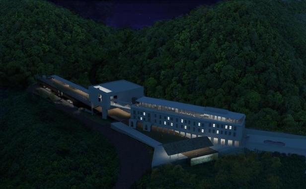 Nesse espaço, privilegiado ponto de observação para toda a paisagem, foi instalada uma leve construção em estrutura metálica e fechamento em vidro capaz de abrigar a lanchonete – destinada aos turistas do complexo – e o restaurante do hotel.